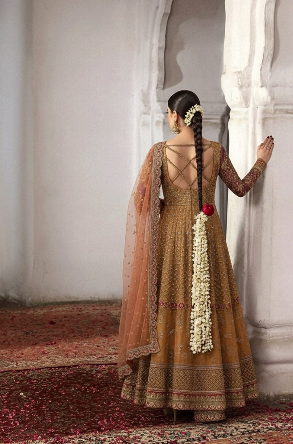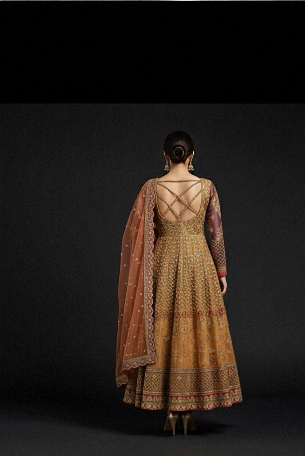 • Signature Duppatta: Draped with a soft, coordinating net dupatta, meticulously bordered with matching gold and maroon embroidery, completing the look with ethereal grace.