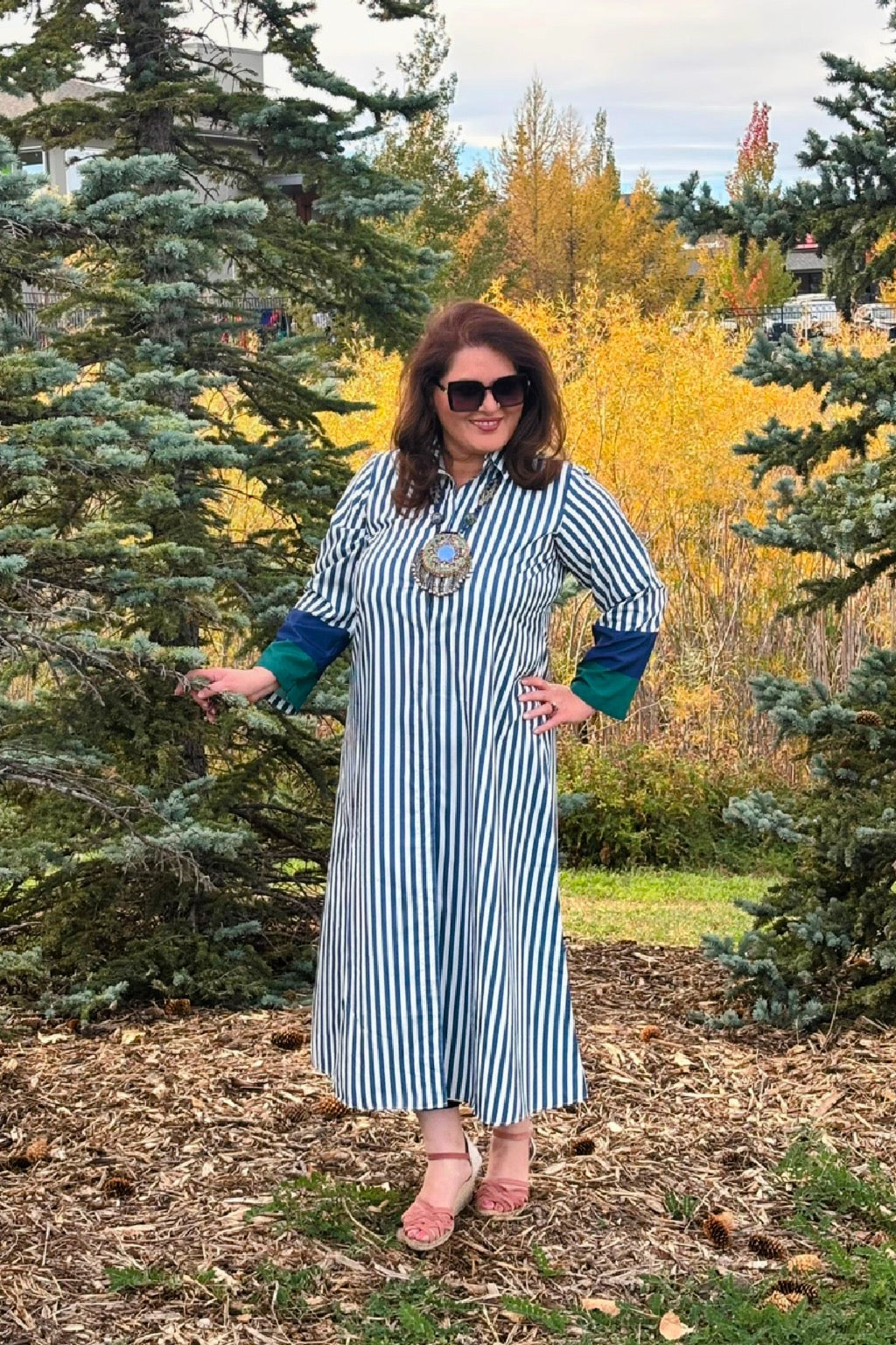 Details • Long shirt-dress silhouette with vertical stripes • Button-down front with classic collar • Contrasting cuffs in green and blue for a bold accent • Lightweight grip, non wrinkle for everyday wear