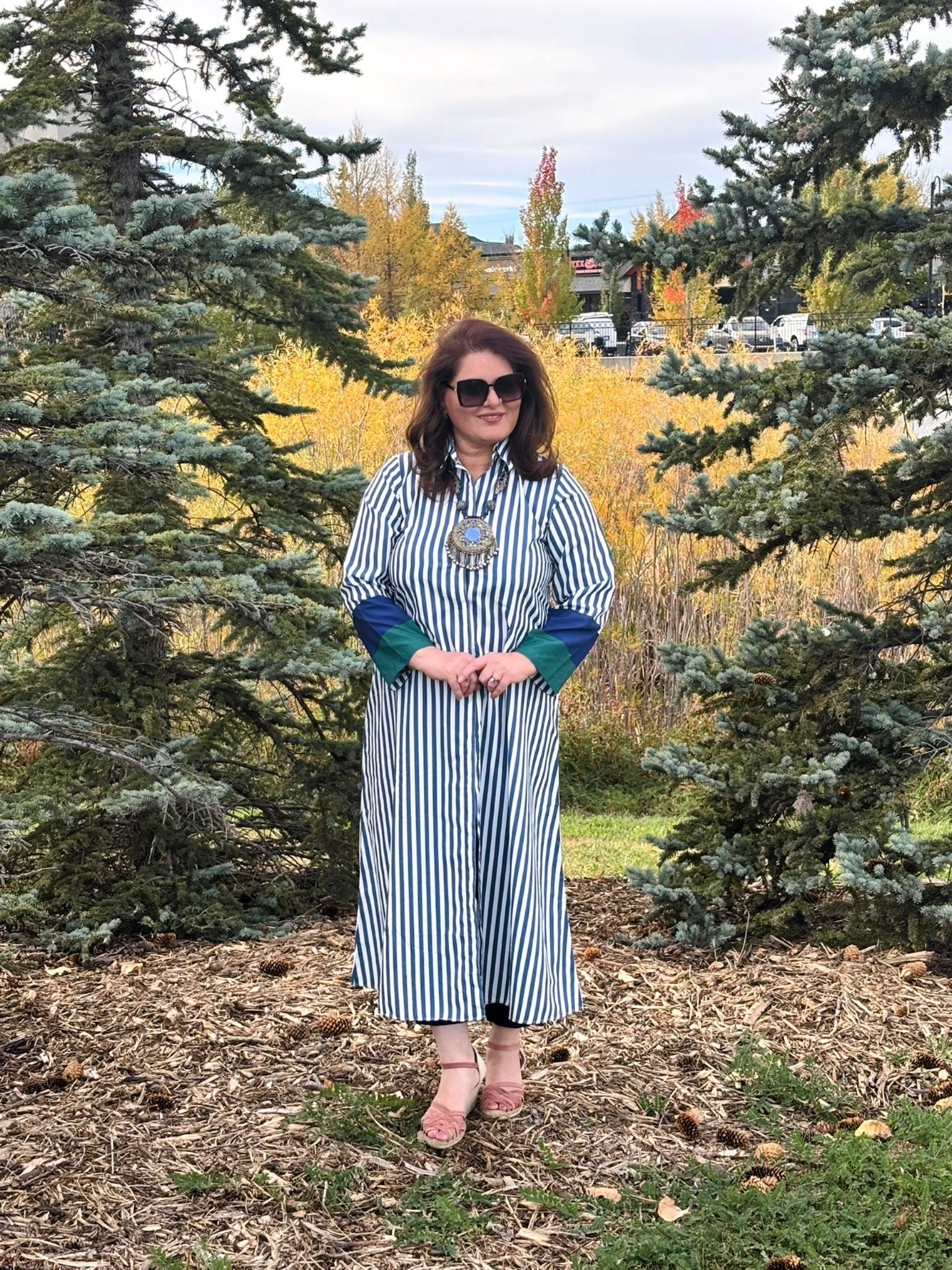 Ash Leaf Modern, sleek, and full of understated charm, Ash Leaf blends timeless stripes with a refreshing twist. The cool navy-and-white pattern symbolizes balance and clarity, while the bold green and blue cuffs add a vibrant, nature-inspired touch. Just like the ash tree, known for its resilience and elegance, this dress carries a quiet strength — making it perfect for effortless everyday sophistication.
