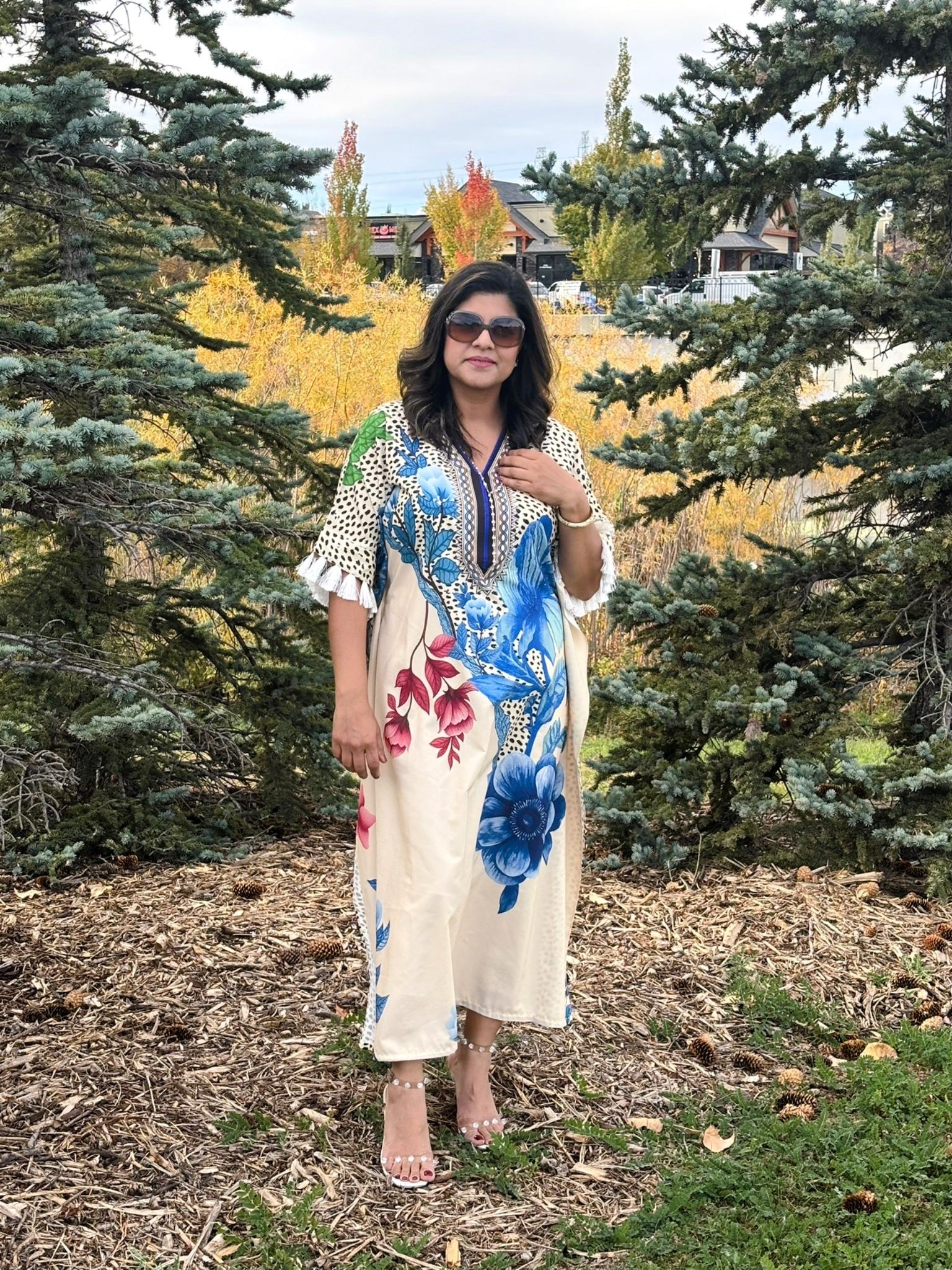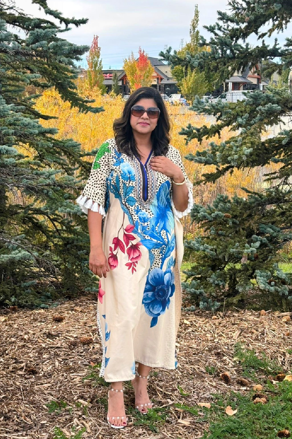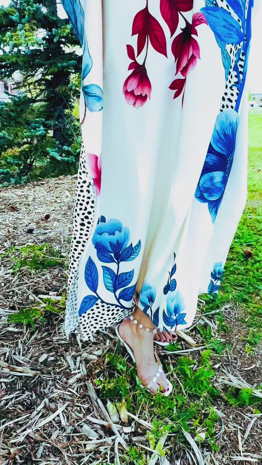 Styling Tips • Pair with silver or pearl jewelry for a soft, feminine look. • Style with nude heels or pastel-toned flats to complement the floral accents. • Add a light denim or pastel cardigan for cooler evenings. • Carry a sleek clutch in white or soft pink for a polished finish.