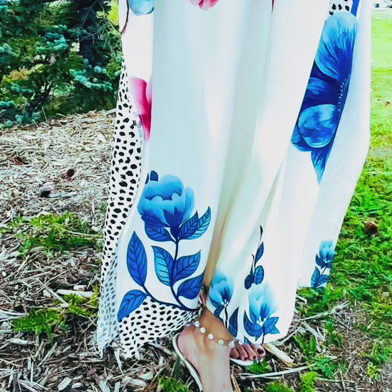 Bluebell Leaf Fresh, graceful, and full of charm, Bluebell Leaf celebrates the delicate beauty of wild bluebells swaying in a soft autumn breeze. With its striking blue floral motifs paired with gentle pink accents on a crisp white base, this dress embodies elegance and serenity while capturing the romance of the changing season. The structured neckline and patterned details add refinement, making it a versatile piece for both casual outings and graceful evening gatherings.