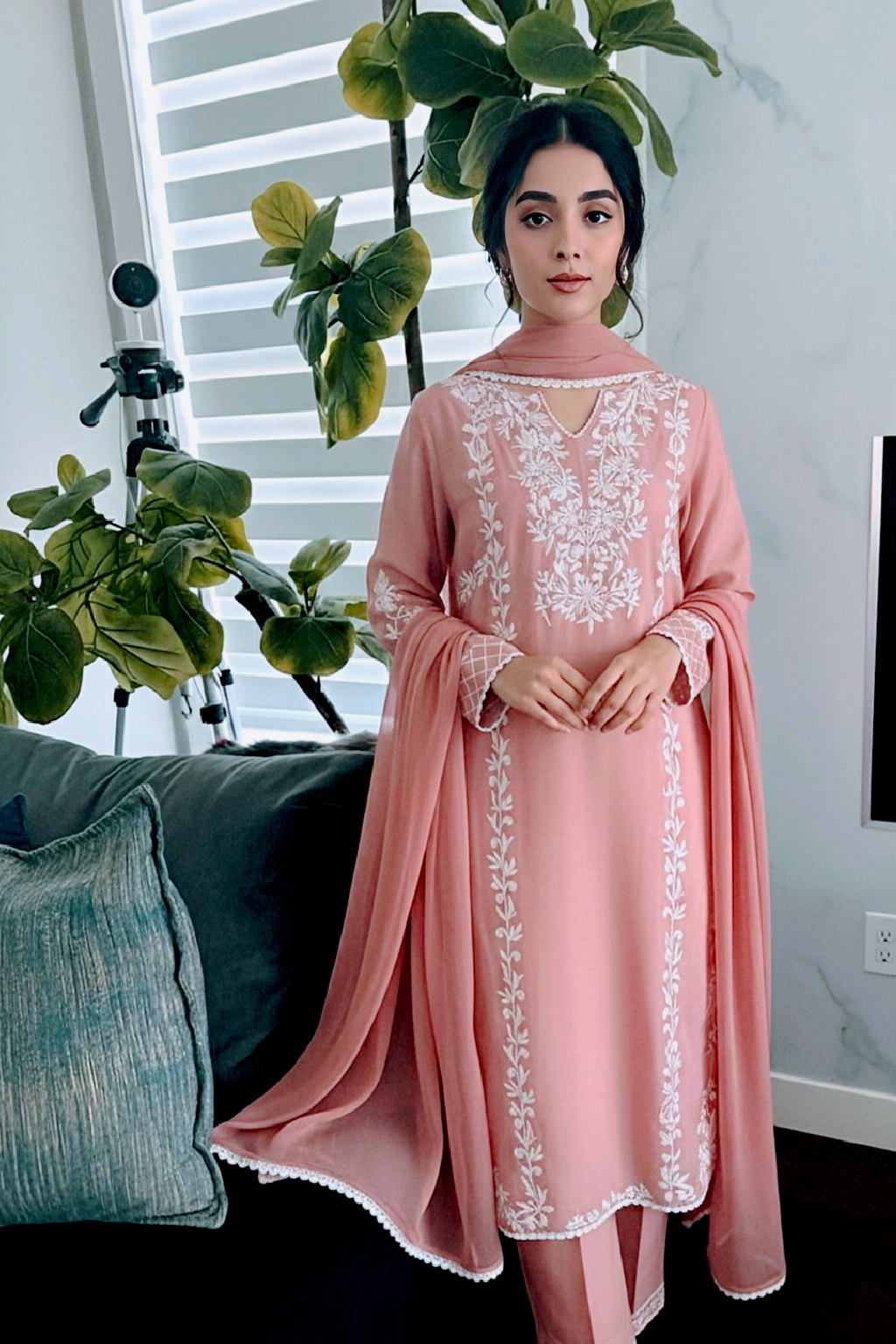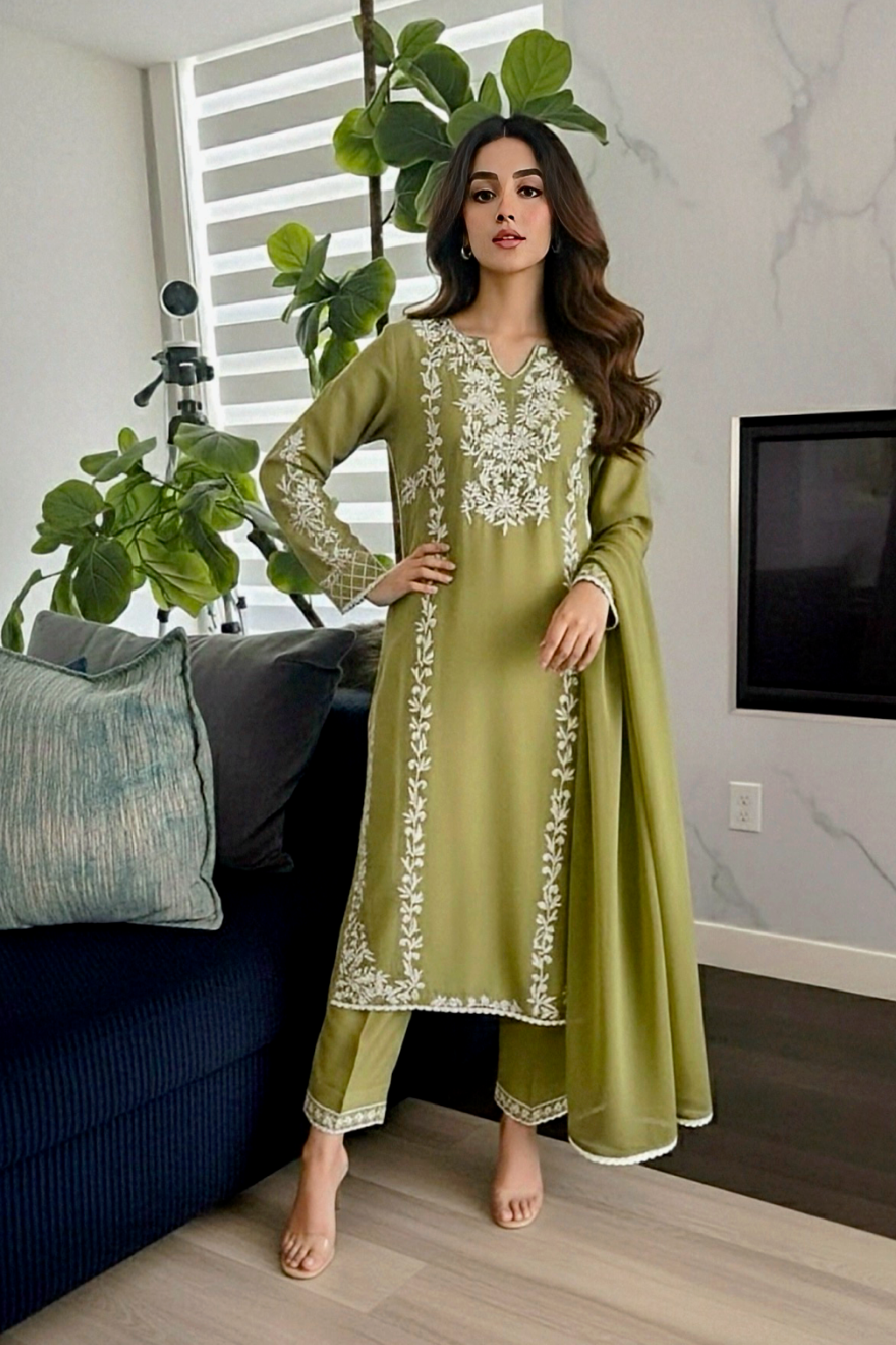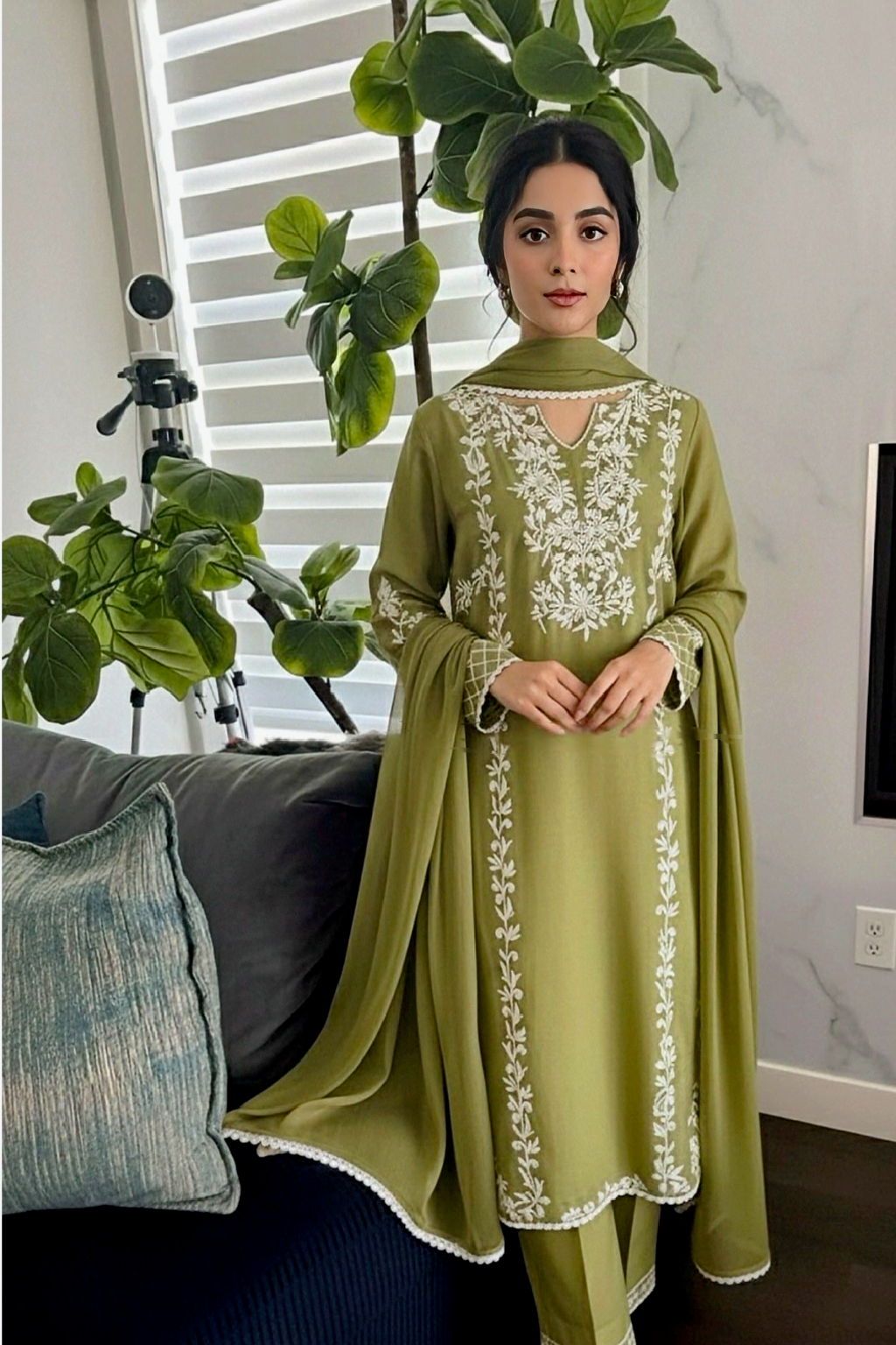 A soft pink and olive green creation inspired by and to go with time of Duha of a morning. Draped in soft blush pink and olive chiffon, Duha embodies serenity and grace. The delicate white embroidery reflects the purity of daylight, making it a perfect choice for celebrations that call for elegance and poise in daytime.
