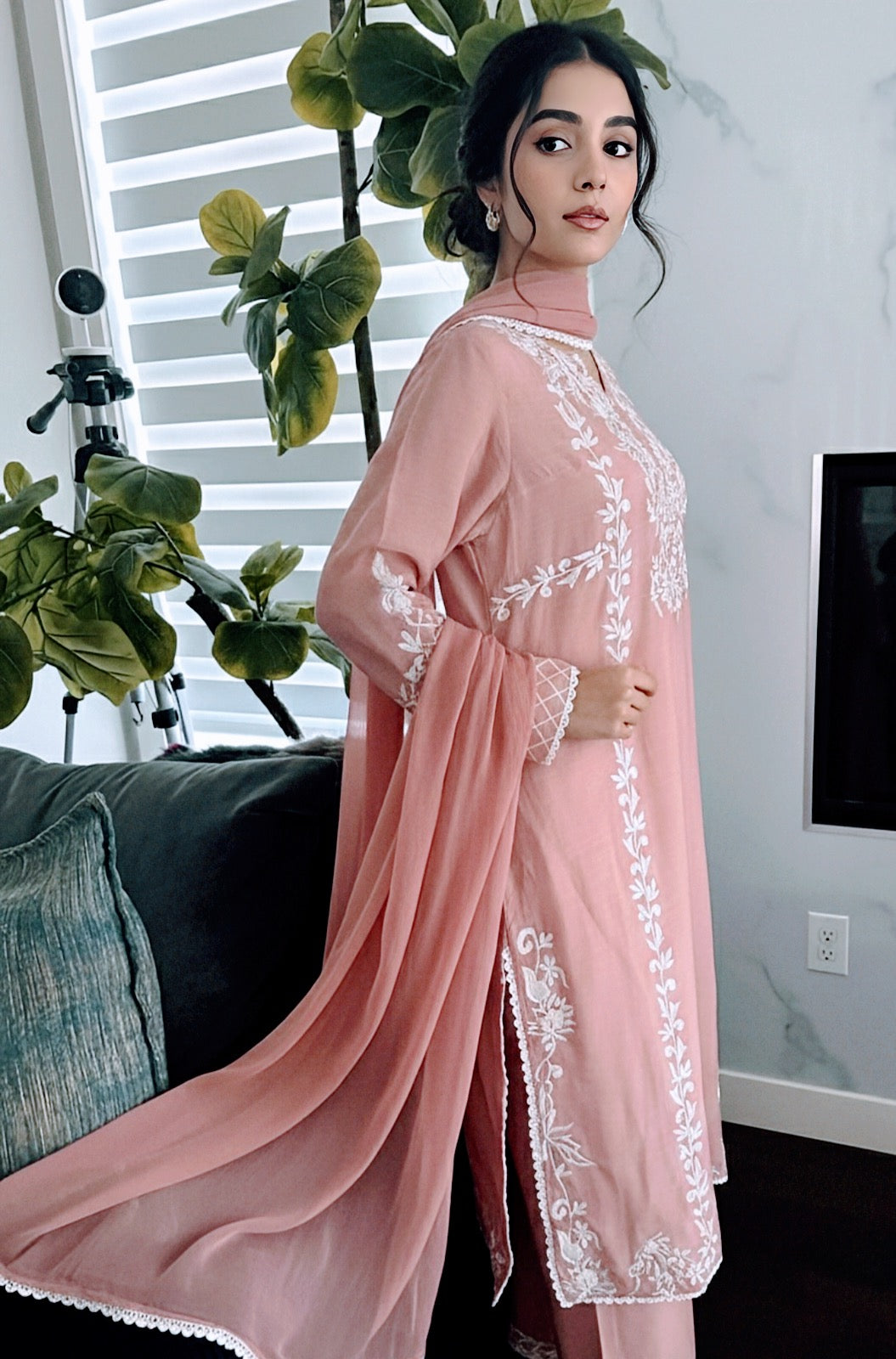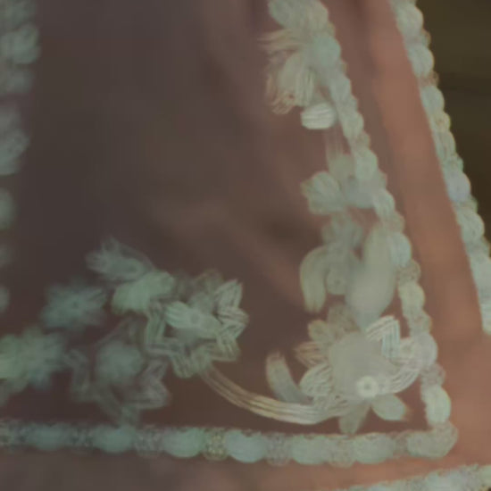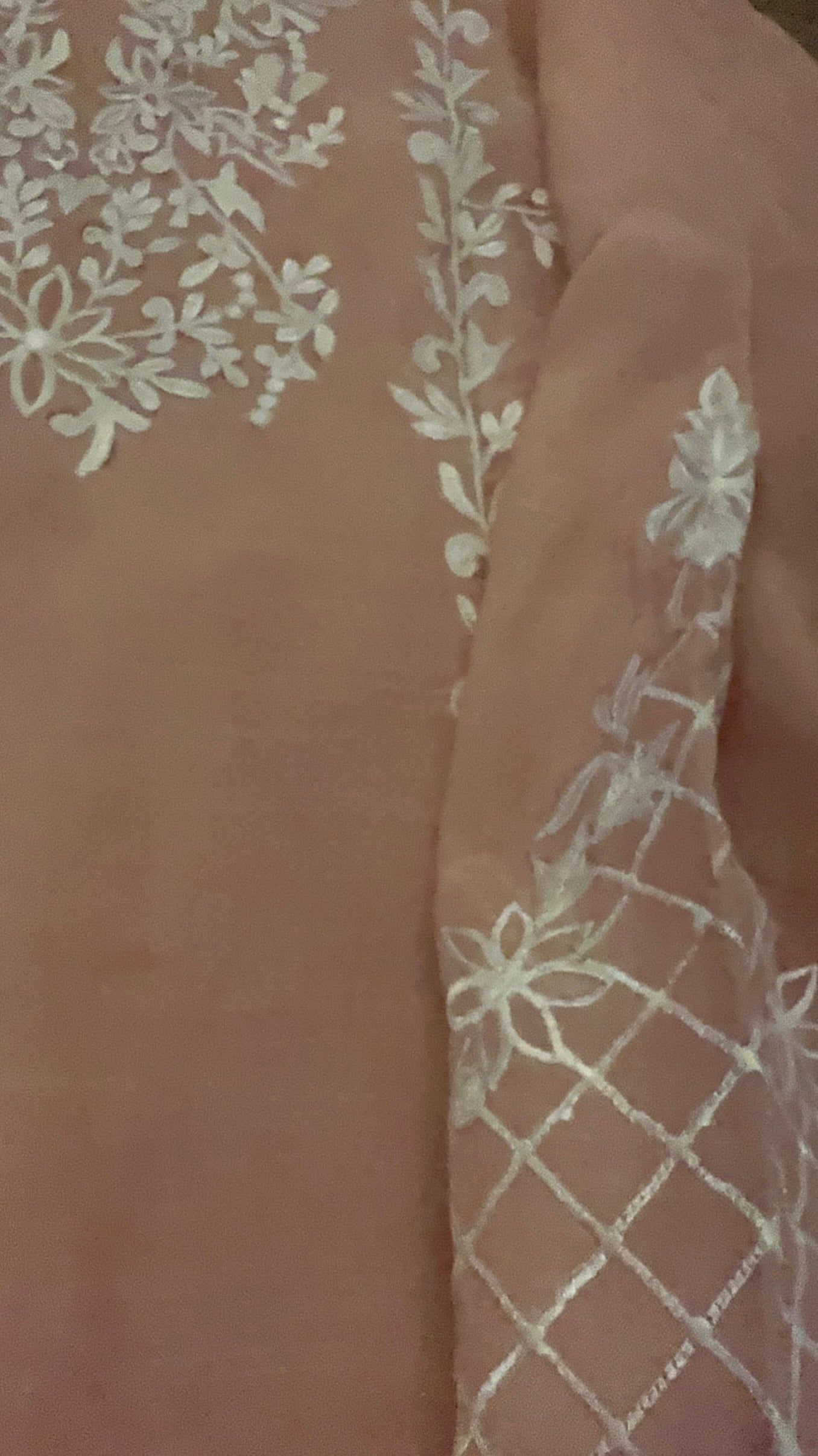 A soft pink and olive green creation inspired by and to go with time of Duha of a morning. Draped in soft blush pink and olive chiffon, Duha embodies serenity and grace. The delicate white embroidery reflects the purity of daylight, making it a perfect choice for celebrations that call for elegance and poise in daytime.