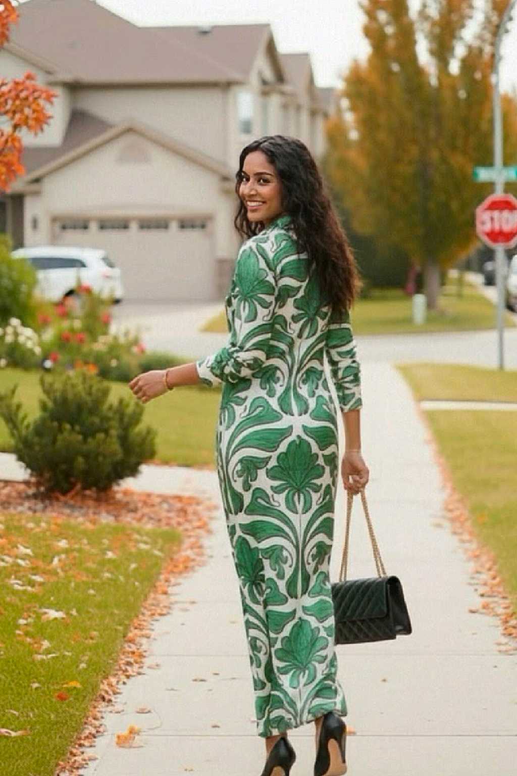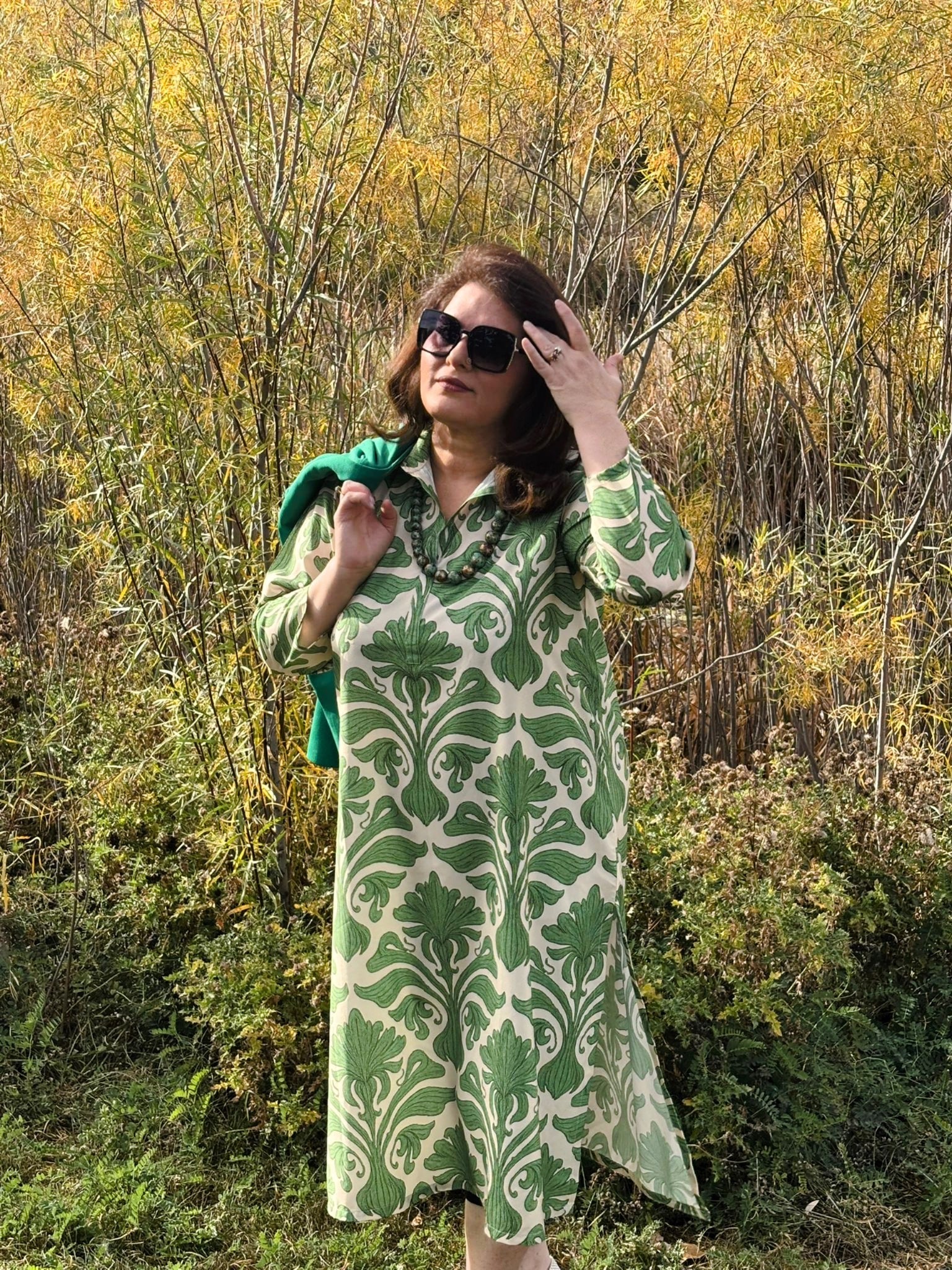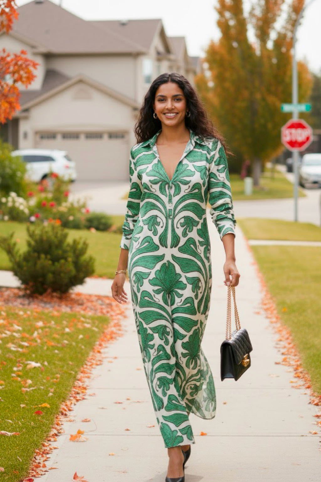 Details • Flowing, ankle-length silhouette • Soft collared neckline with button-down design • Bold emerald sycamore-inspired leafy motif • Lightweight, breathable fabric for comfort • Relaxed yet refined fit