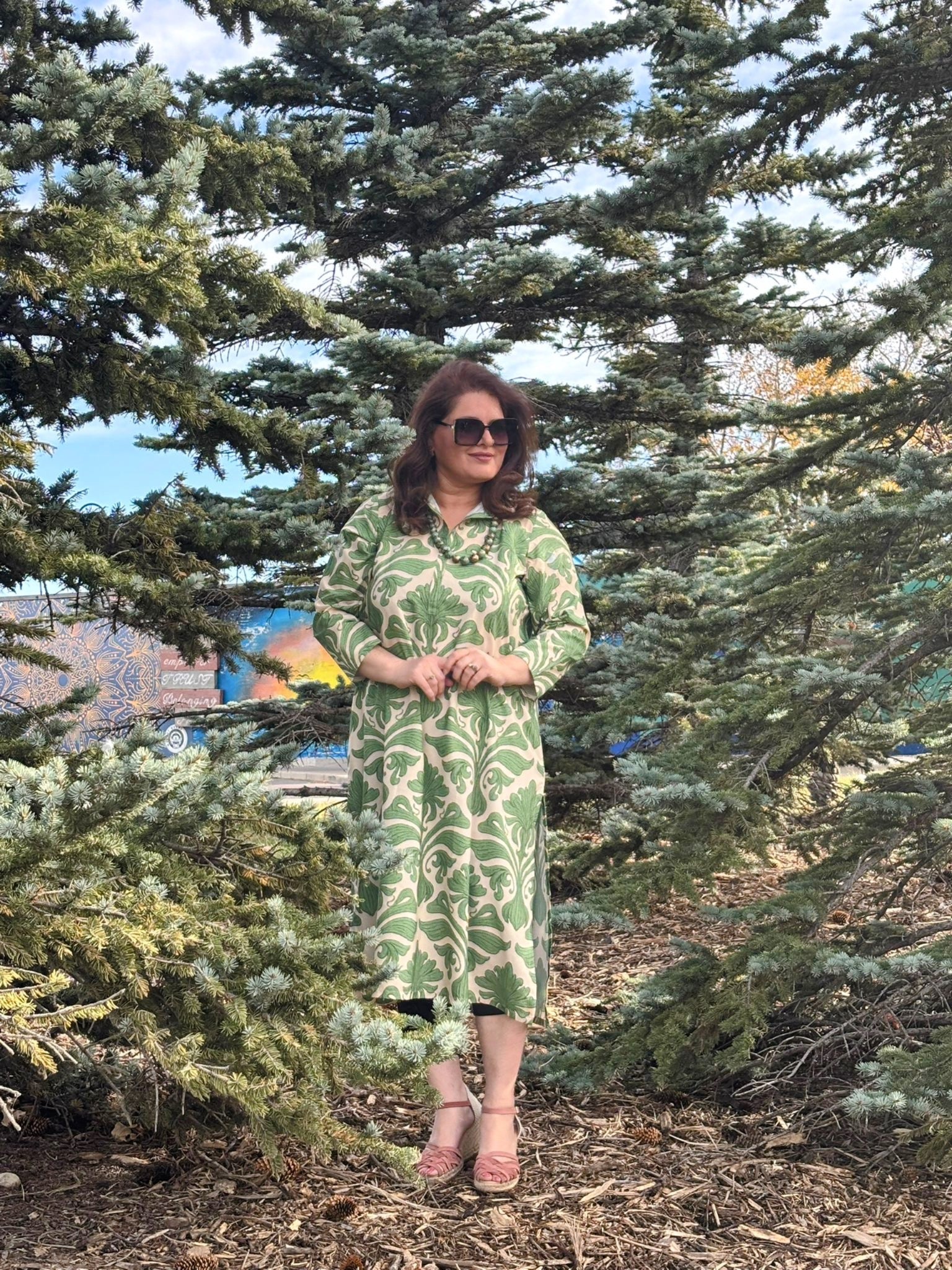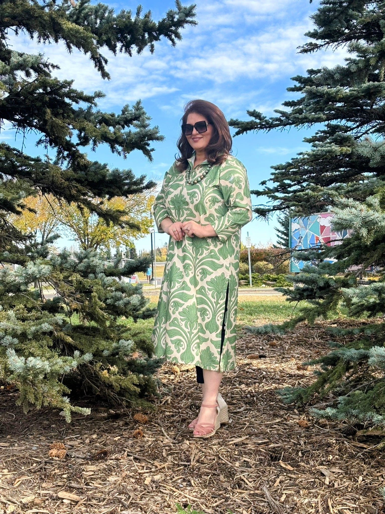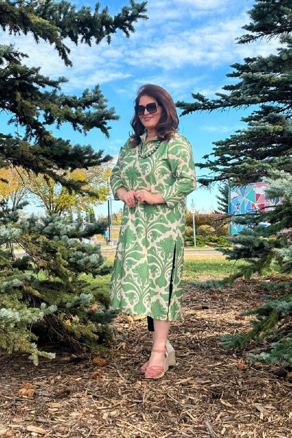Details • Flowing, ankle-length silhouette • Soft collared neckline with button-down design • Bold emerald sycamore-inspired leafy motif • Lightweight, breathable fabric for comfort • Relaxed yet refined fit