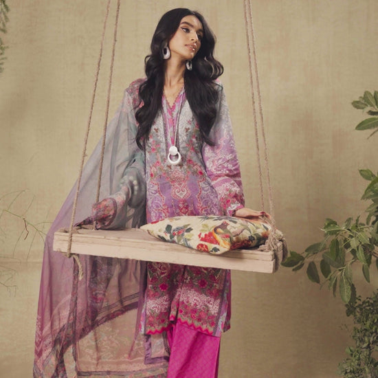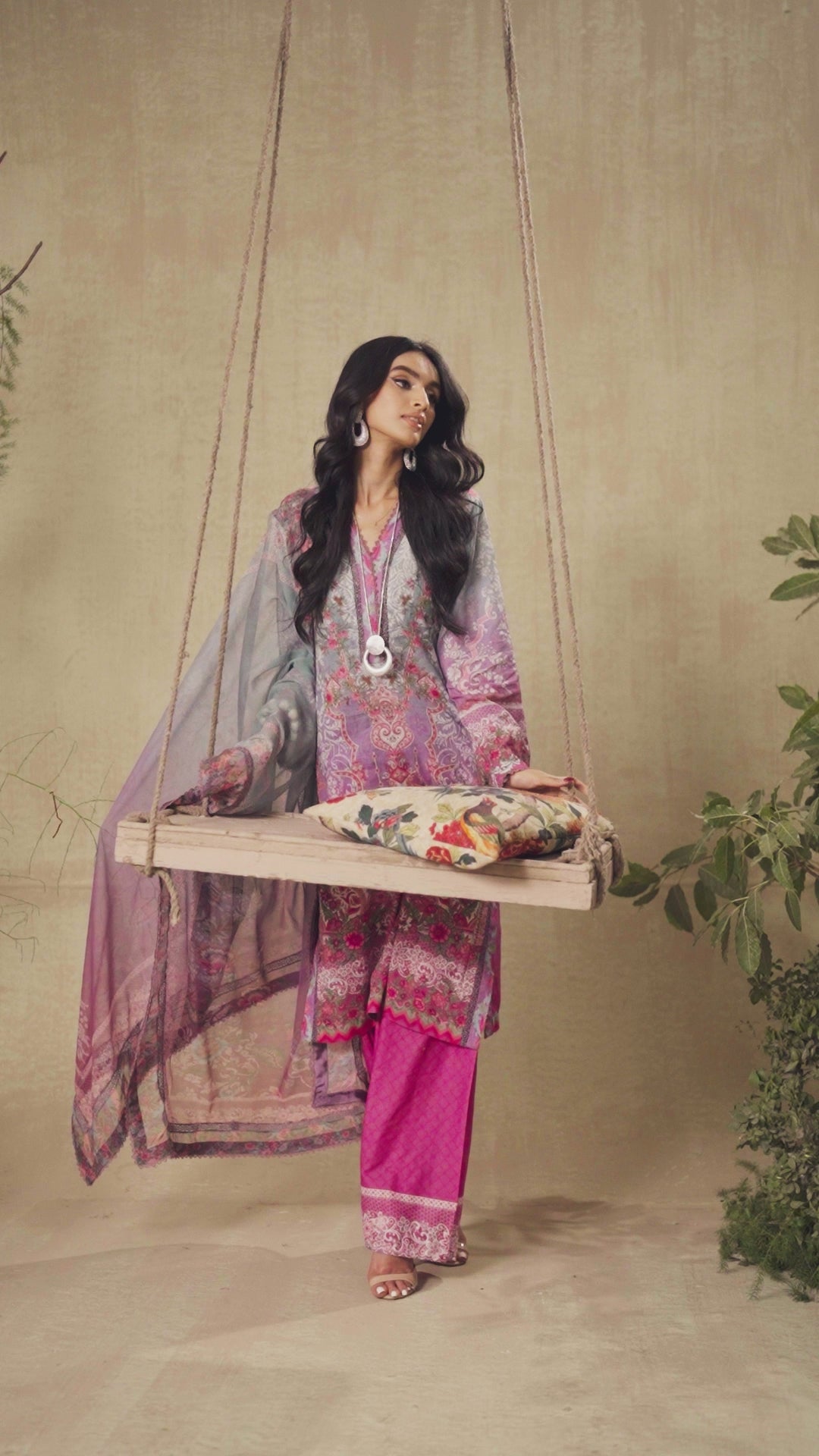 Embrace a romantic, ethereal charm with Gul-e-Anarbar, beautifully crafted from premium soft lawn. Inspired by tulip blossoms, this dreamy ensemble features a soothing palette of sky blue, gentle purple, and blooming pink, capturing the freshness of morning light in a blossoming garden. The chiffon dupatta is elegantly detailed on all four sides, adding a graceful finishing touch.