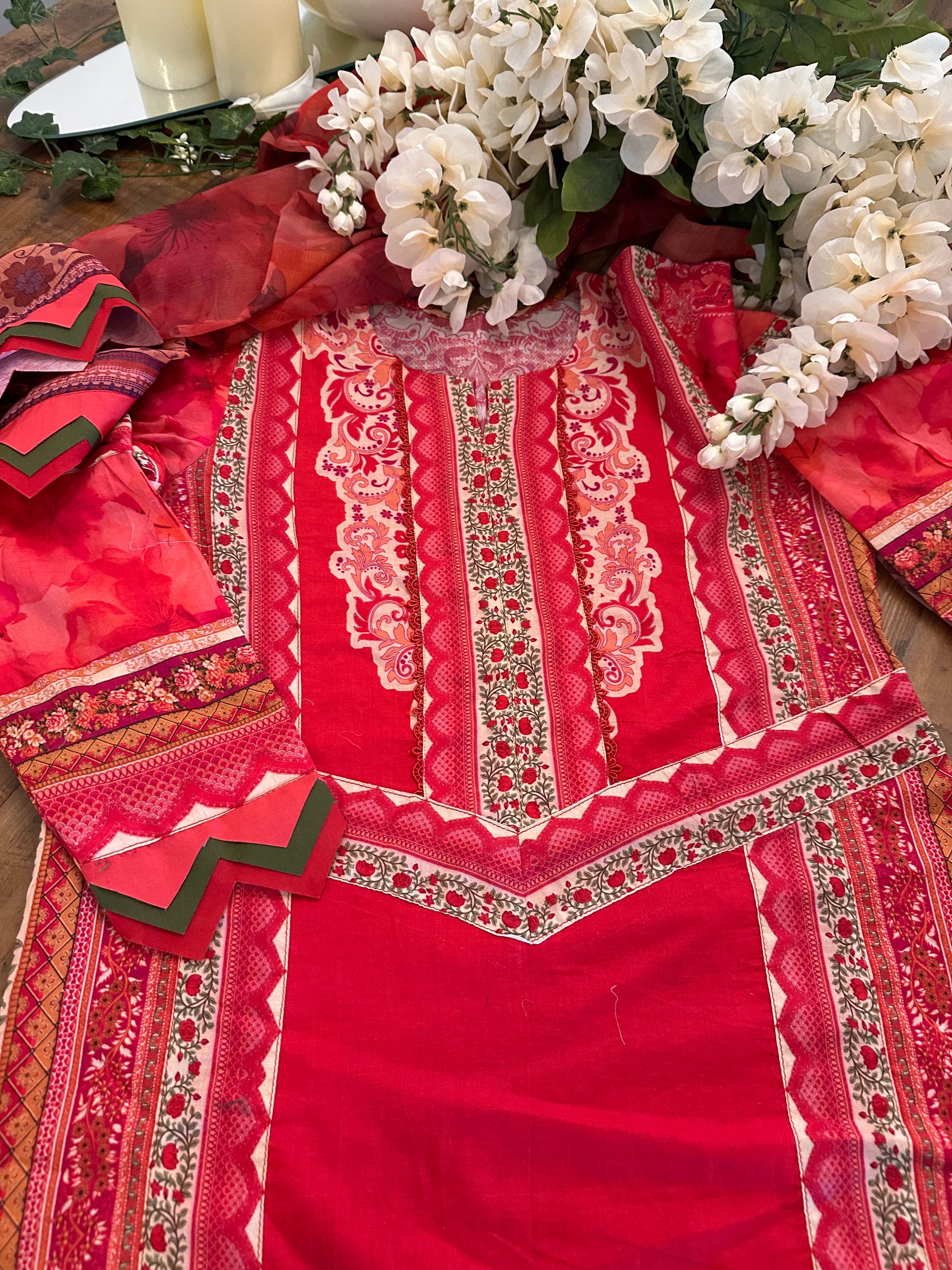 Ignite your style with Gul-e-Gulnar, crafted from premium soft lawn and designed to make a statement. Inspired by tulip blossoms, this bold ensemble showcases fiery orange floral accents that radiate passion and vibrancy, like sun-kissed blooms in full glory. The chiffon dupatta is beautifully finished on all four sides, completing the look with refined elegance.