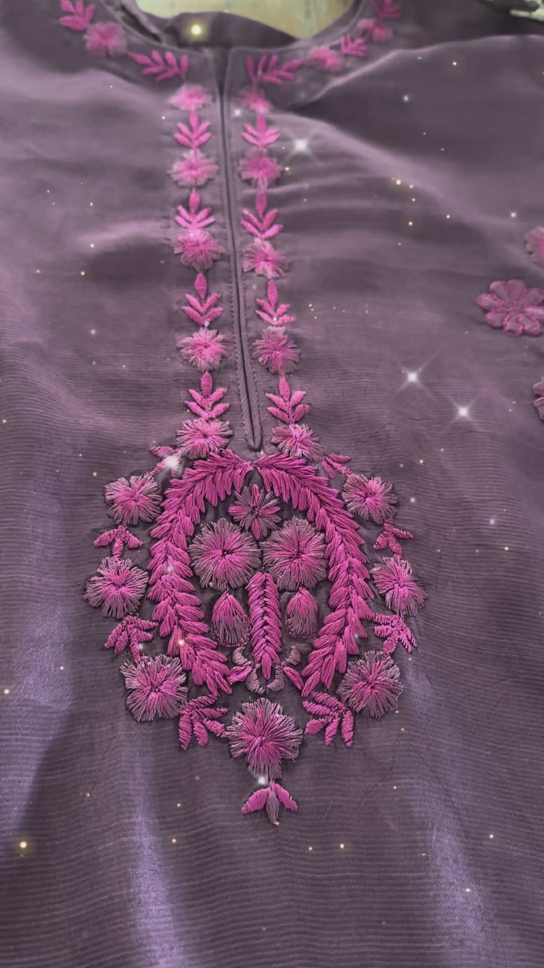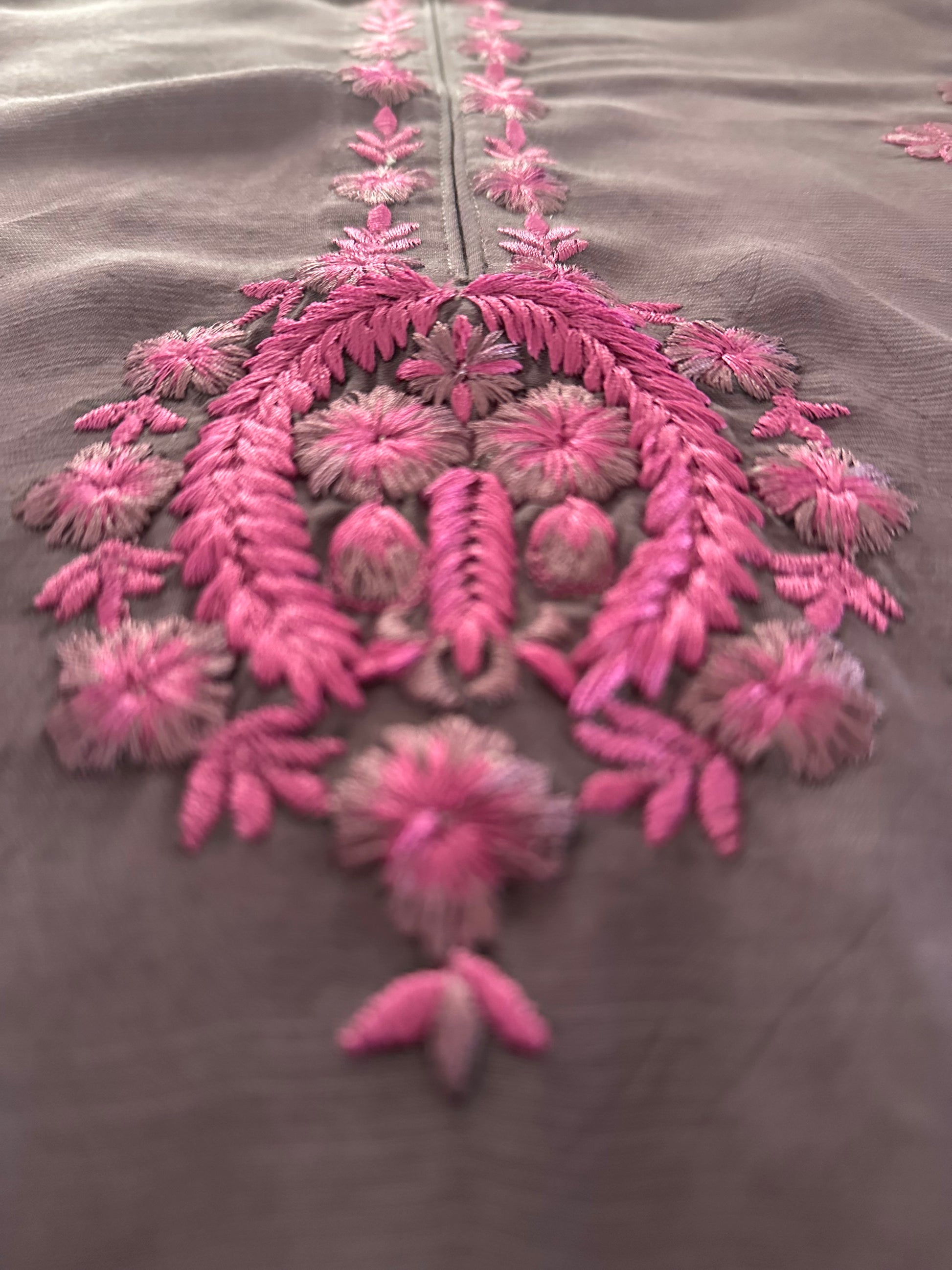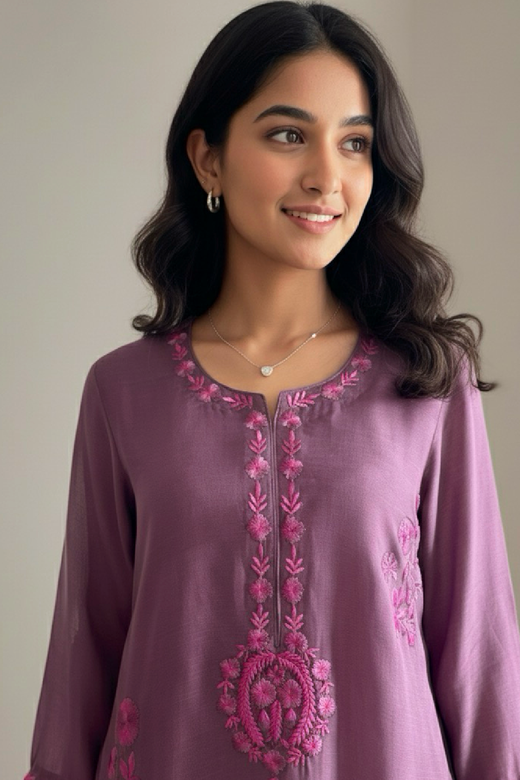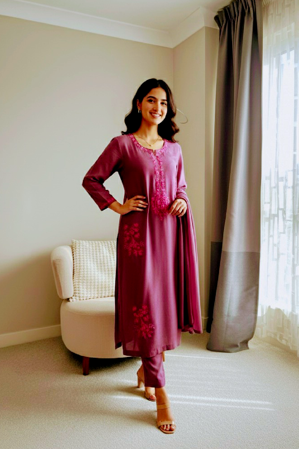 Striking mulberry tone enhanced with contrasting floral embroidery