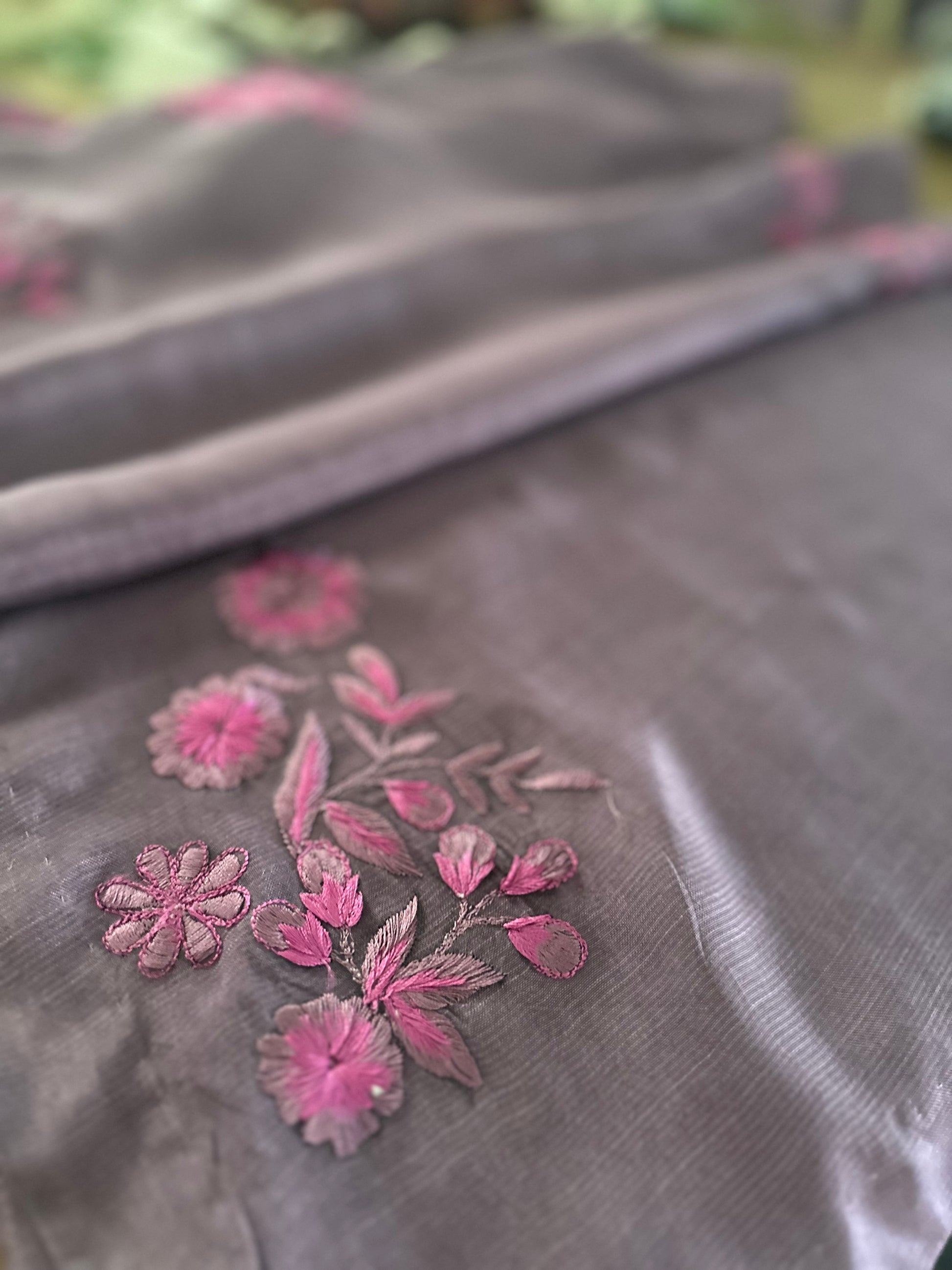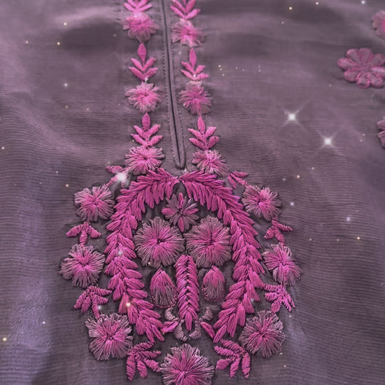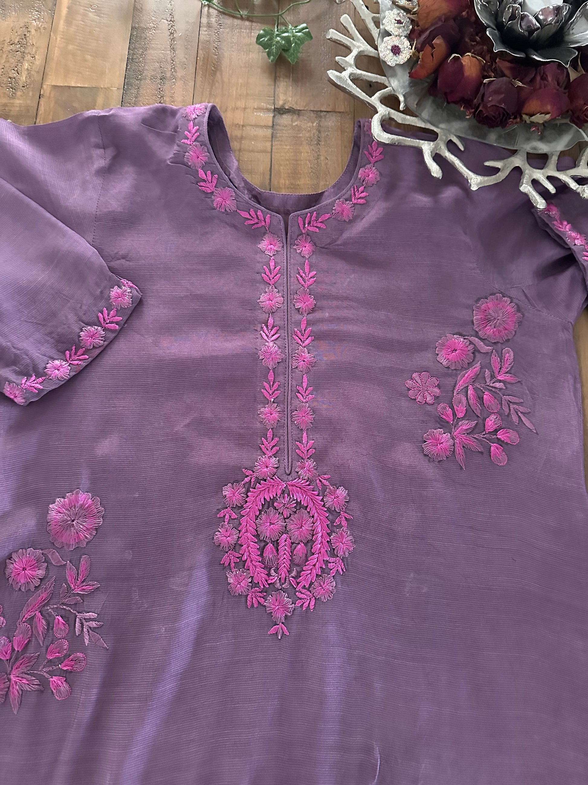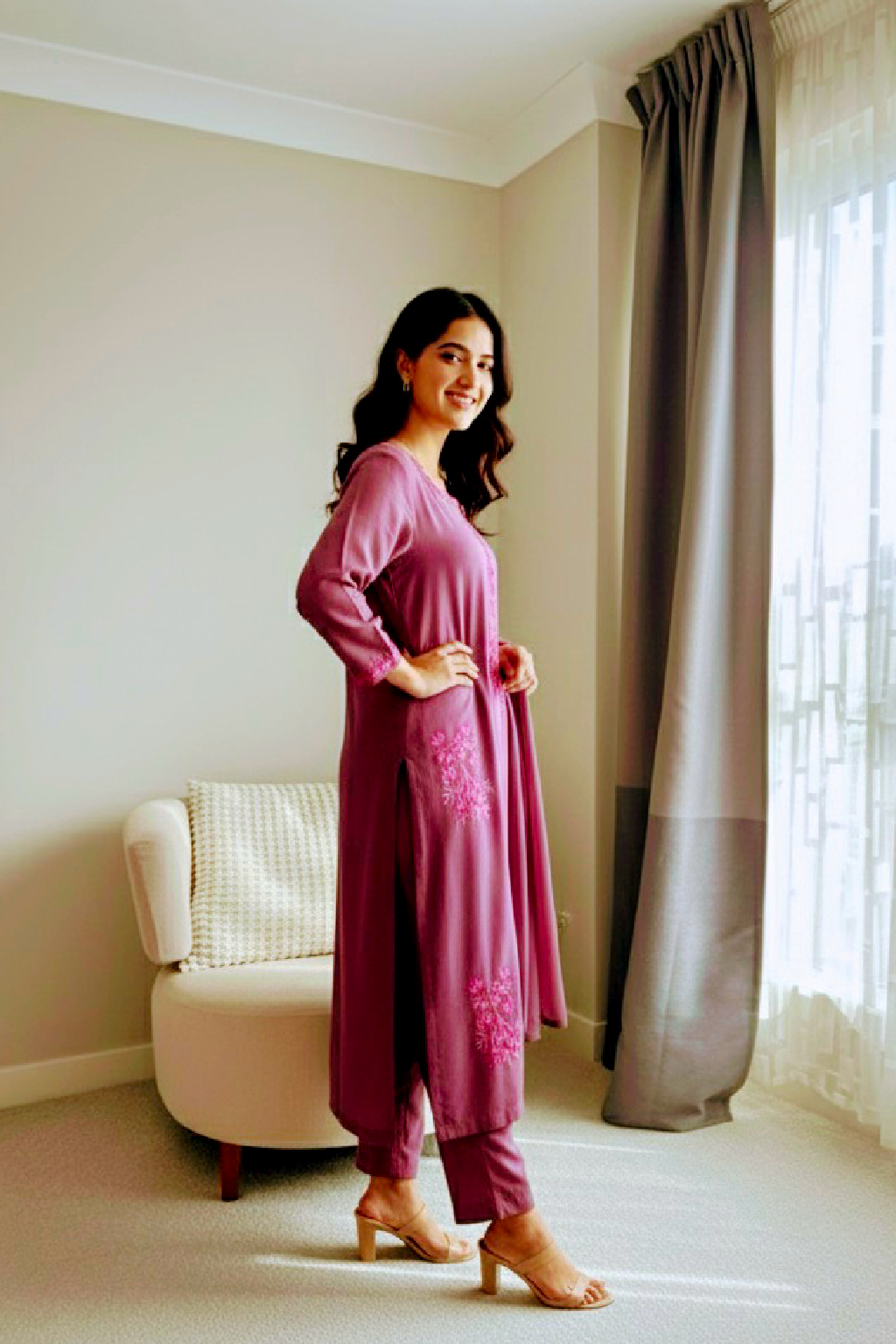 Striking mulberry tone enhanced with contrasting floral embroidery