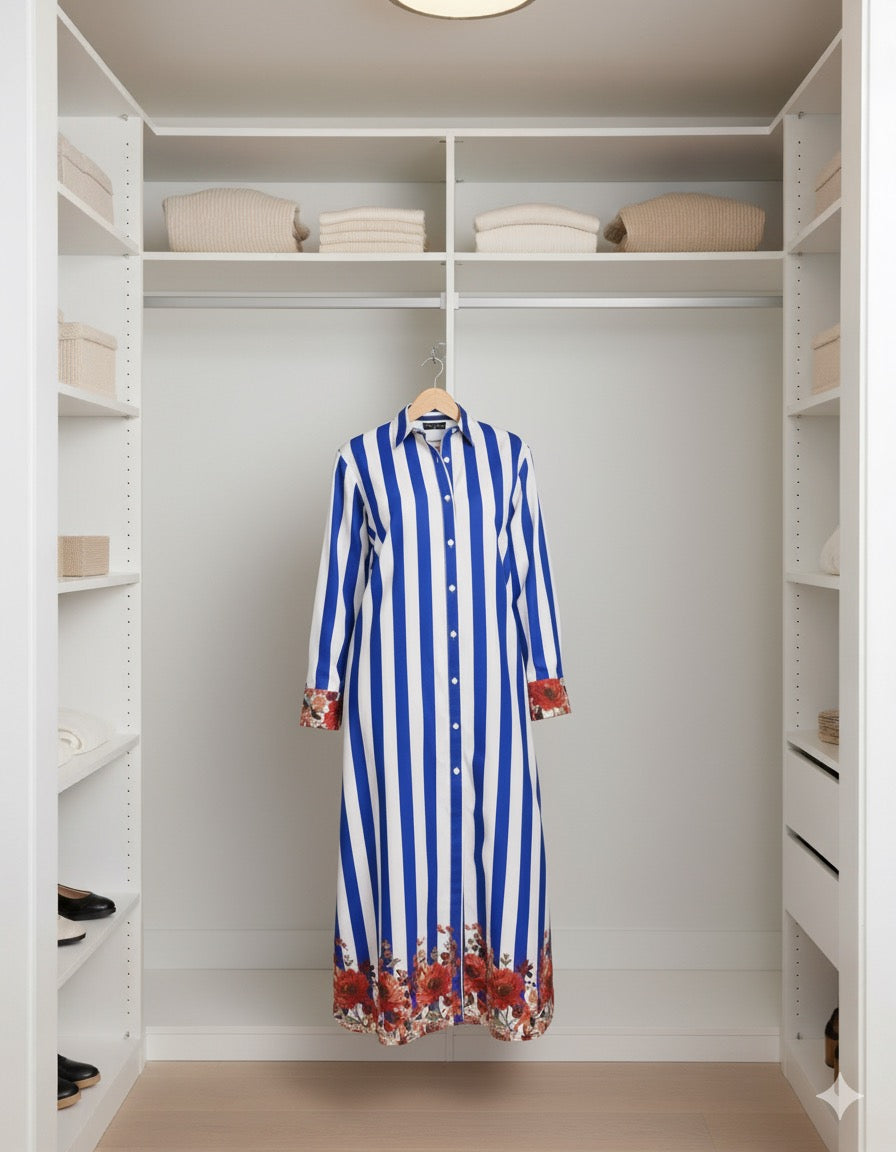 Saffron Leaf Bold, refreshing, and effortlessly chic, Saffron Leaf brings together classic design with a touch of autumn warmth. The crisp blue-and-white stripes symbolize freshness and confidence, while the saffron-red floral accents at the cuffs and hem echo the fiery glow of fall leaves. Flowing and relaxed, this shirt-dress silhouette is perfect for making a statement in both casual and semi-formal settings.