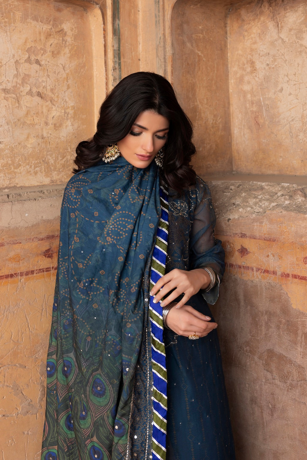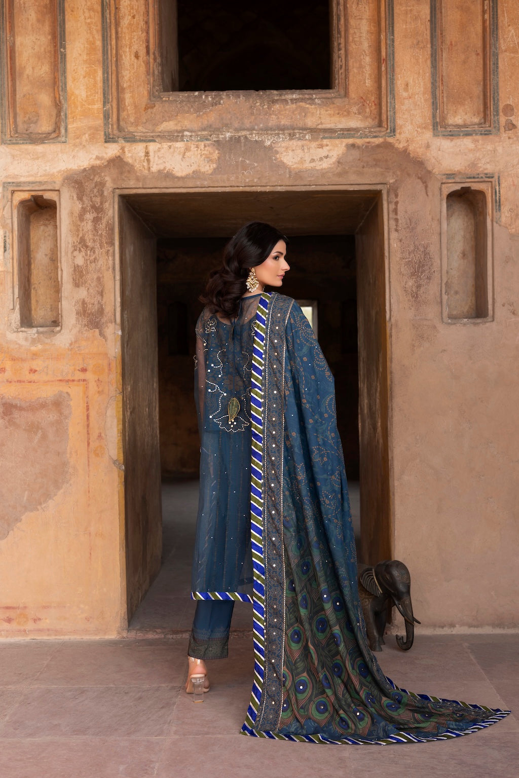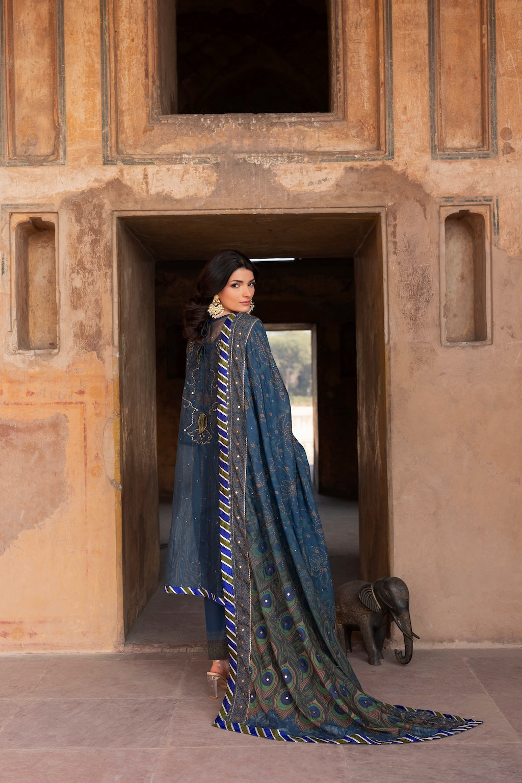 Pair with statement earrings, clean makeup, and a sleek hairstyle. Let the peacock Chunri pattern remain the visual focus.