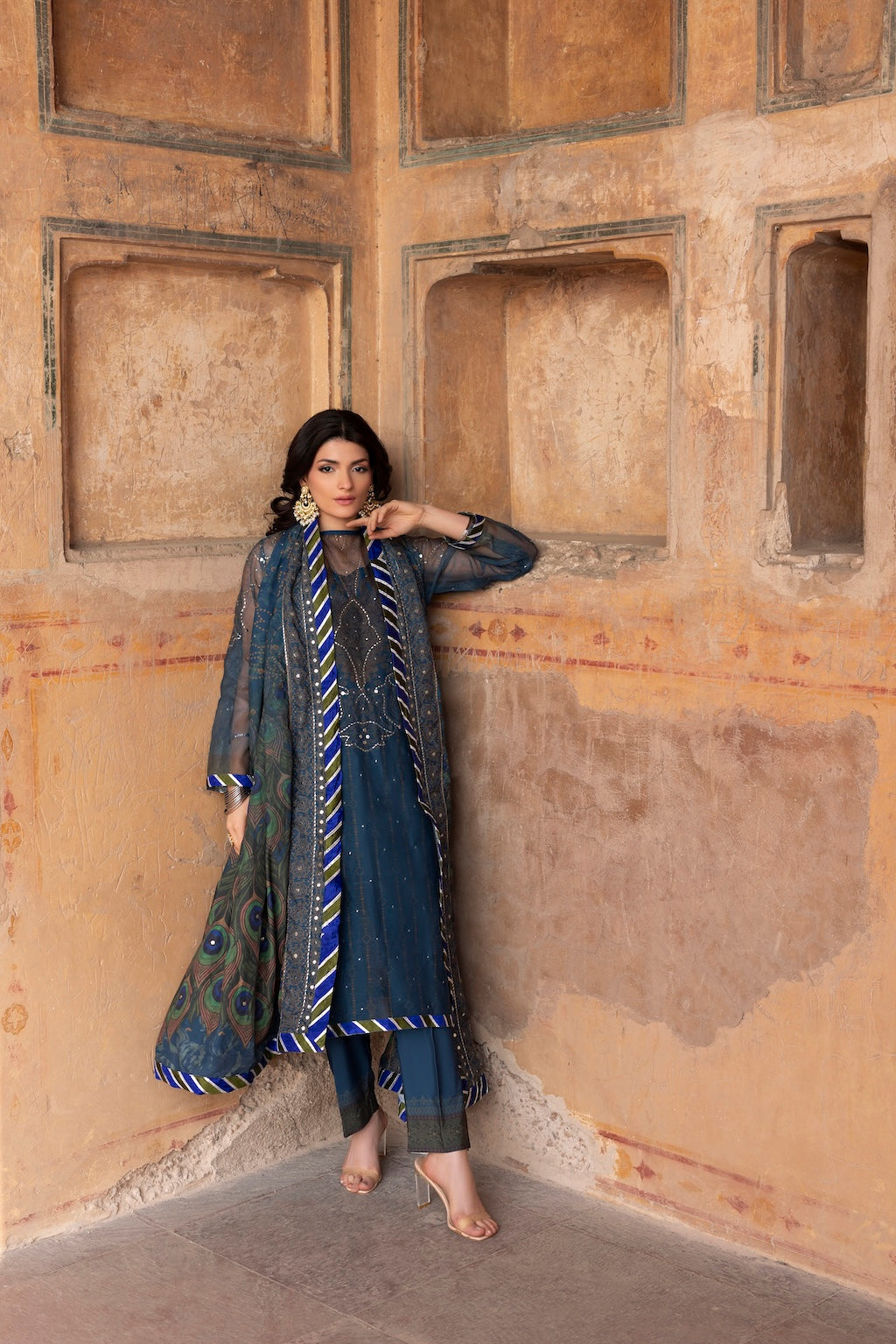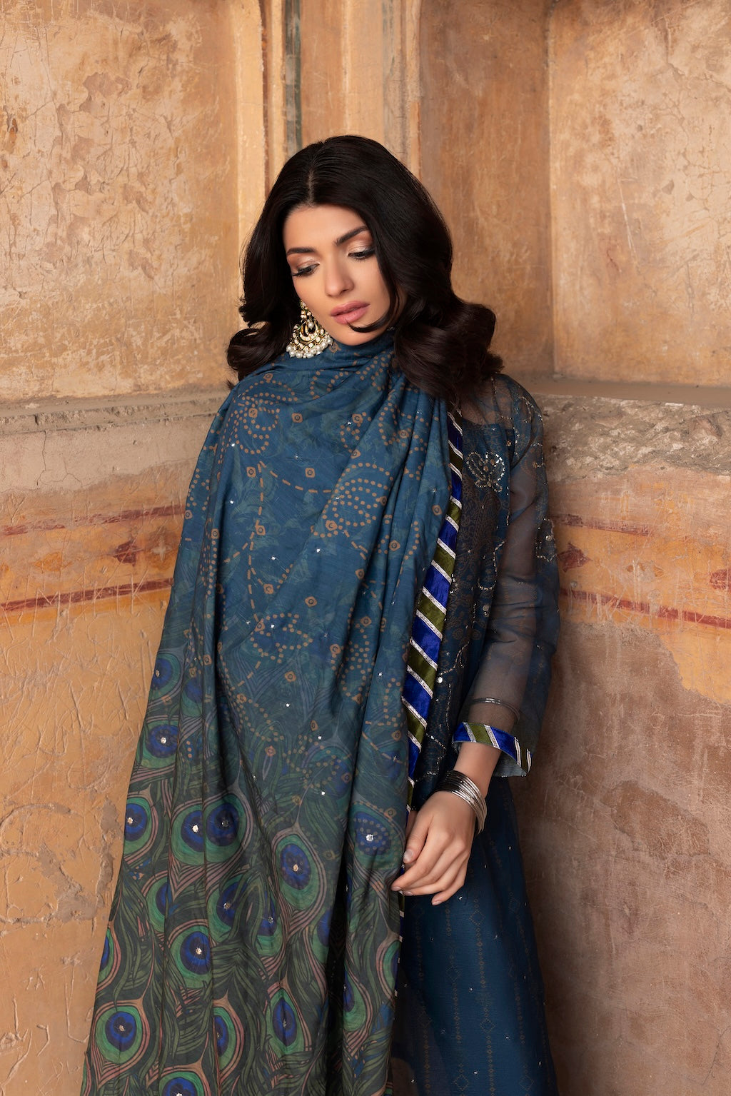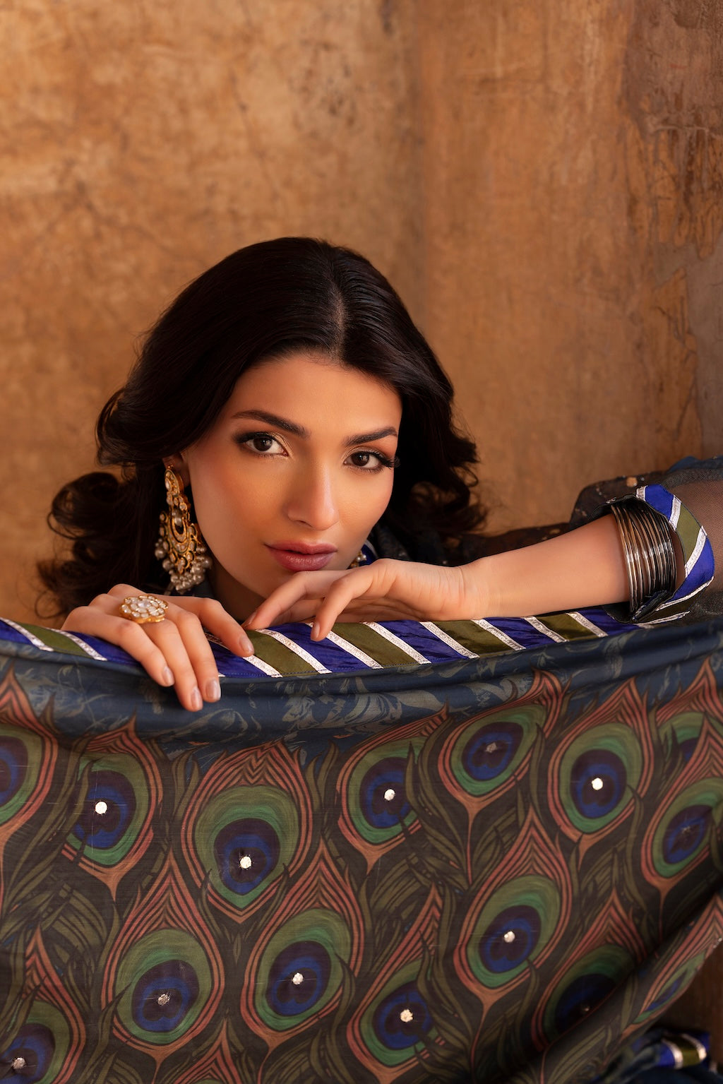 Pair with statement earrings, clean makeup, and a sleek hairstyle. Let the peacock Chunri pattern remain the visual focus.