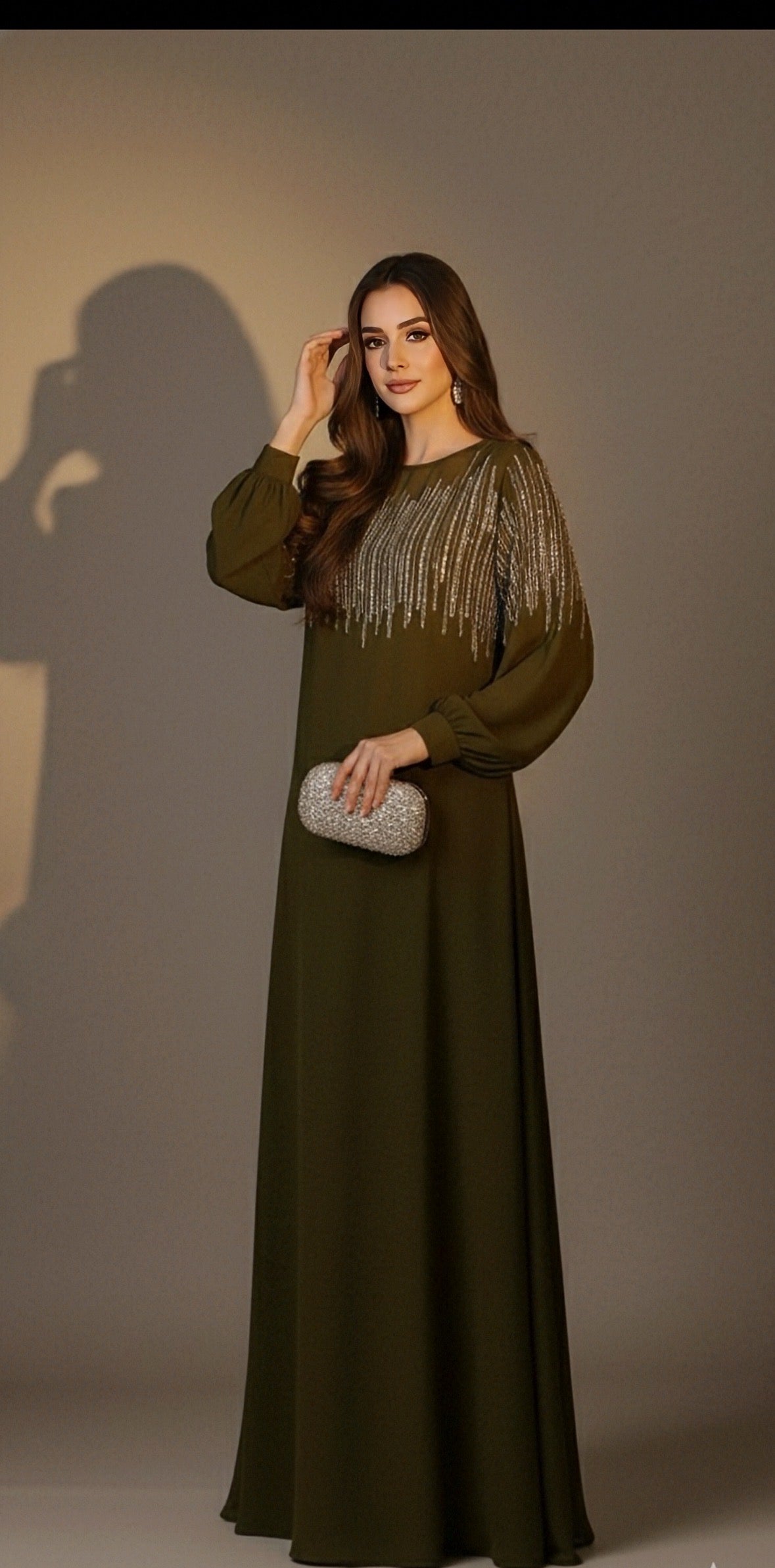 - *Elegant Silhouette* – High neckline, flowing drape, subtle side slit