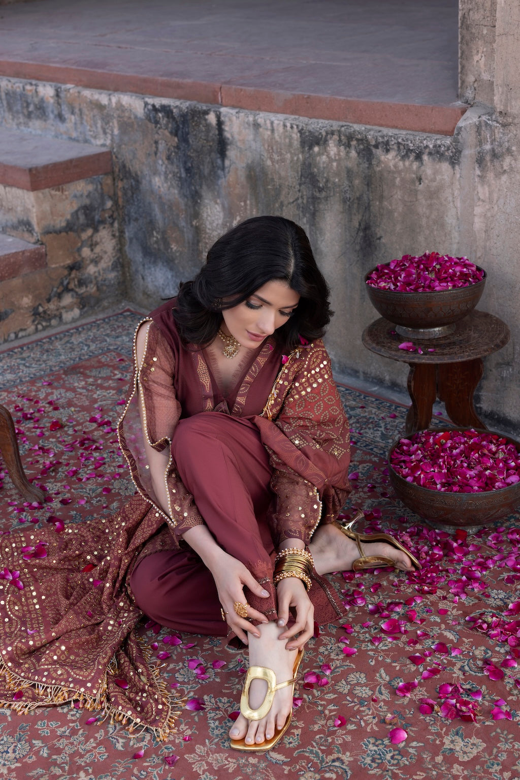 Pair with traditional gold jewelry to complement the warm undertones of the ensemble.