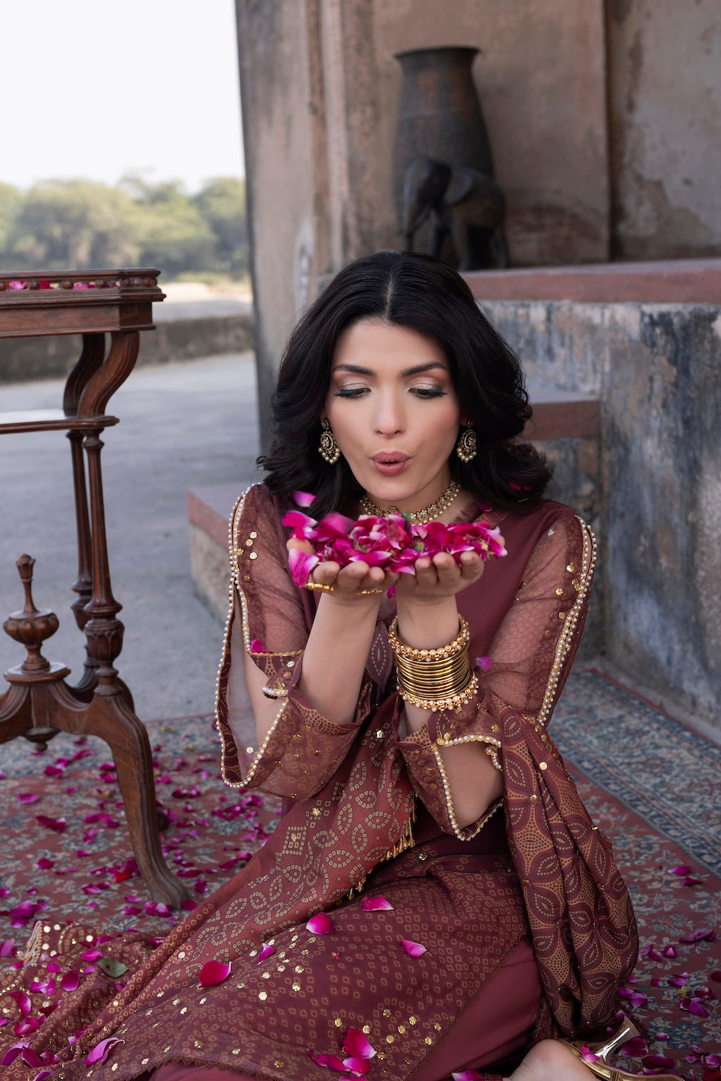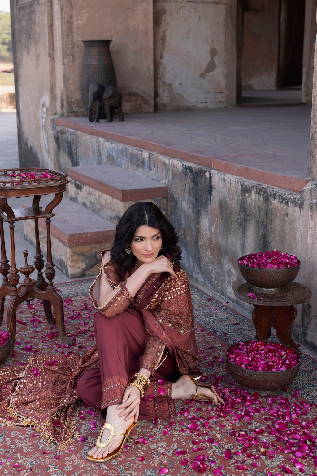 Shaheen is a timeless expression of elegance, crafted with rich traditional detailing and luxurious textures. Adorned with hand worked Kamdani (Mukesh), this ensemble carries a soft, glimmering finish that makes it perfect for festive and formal occasions.