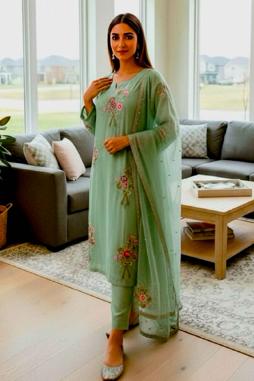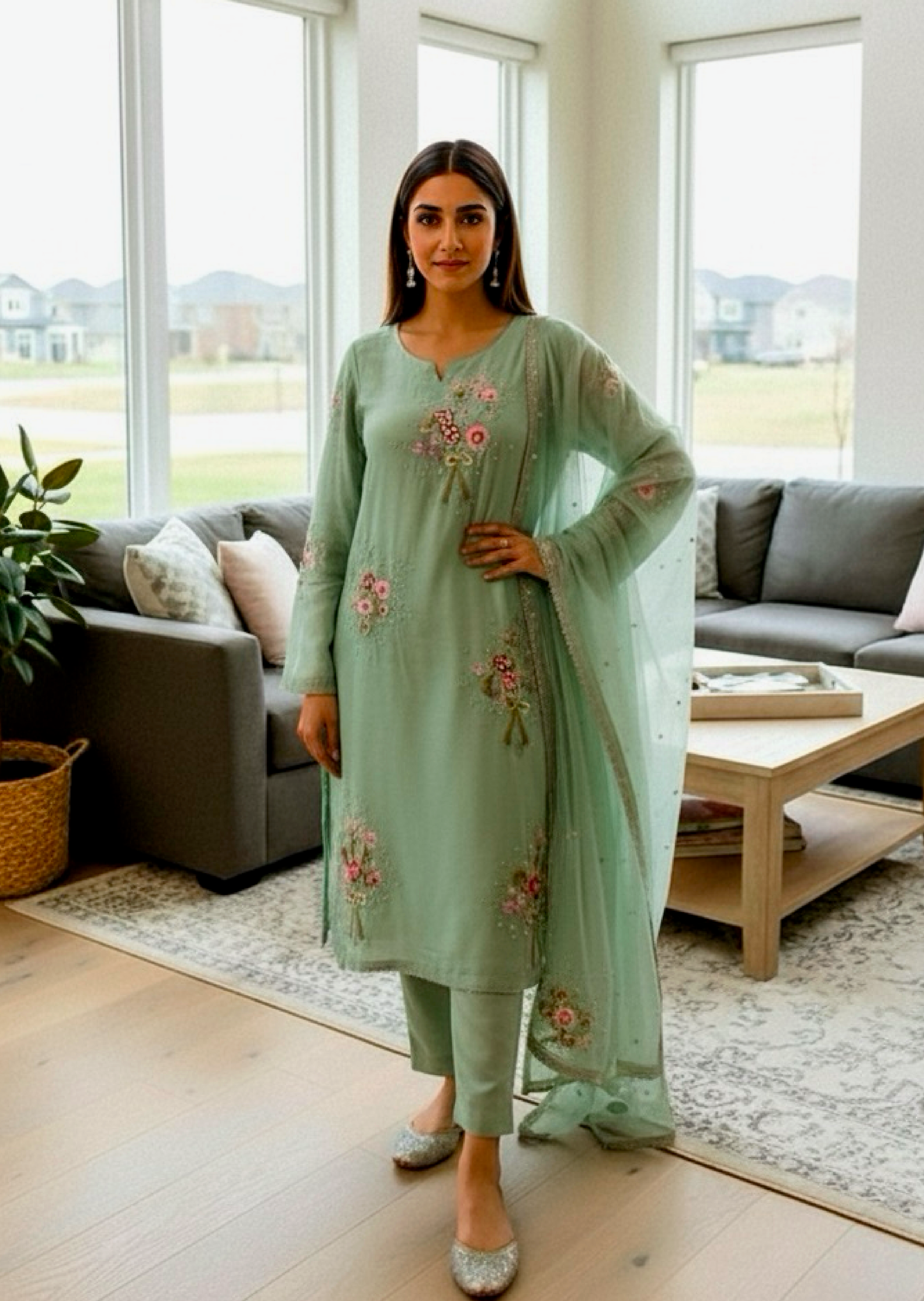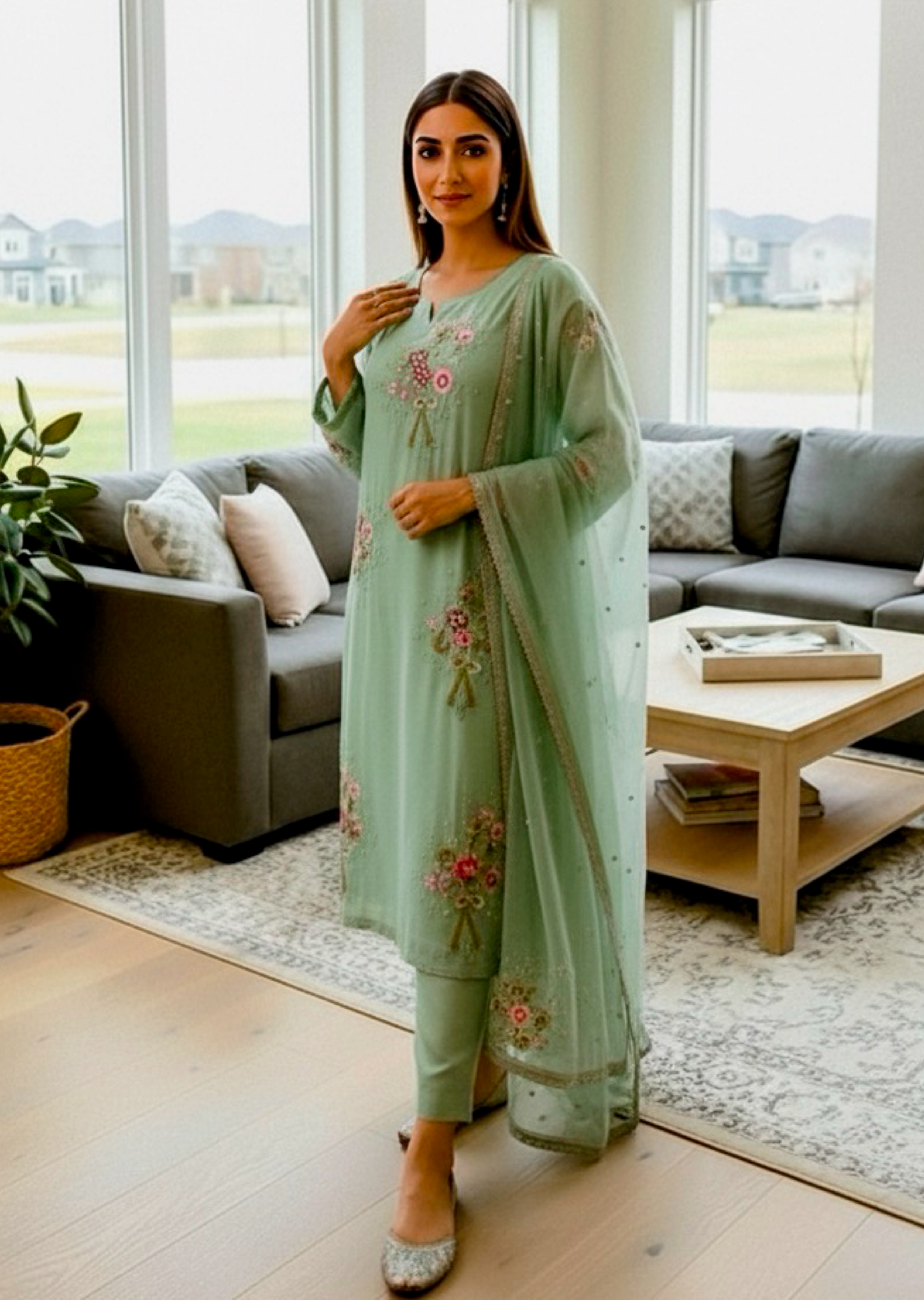 Step into serene elegance with Meadow Whisper, a refreshing creation from the Whisper of Grace collection. In a delicate pastel green adorned with gentle floral embroidery, it captures the quiet beauty of spring meadows — perfect for gatherings that call for understated charm and timeless appeal.