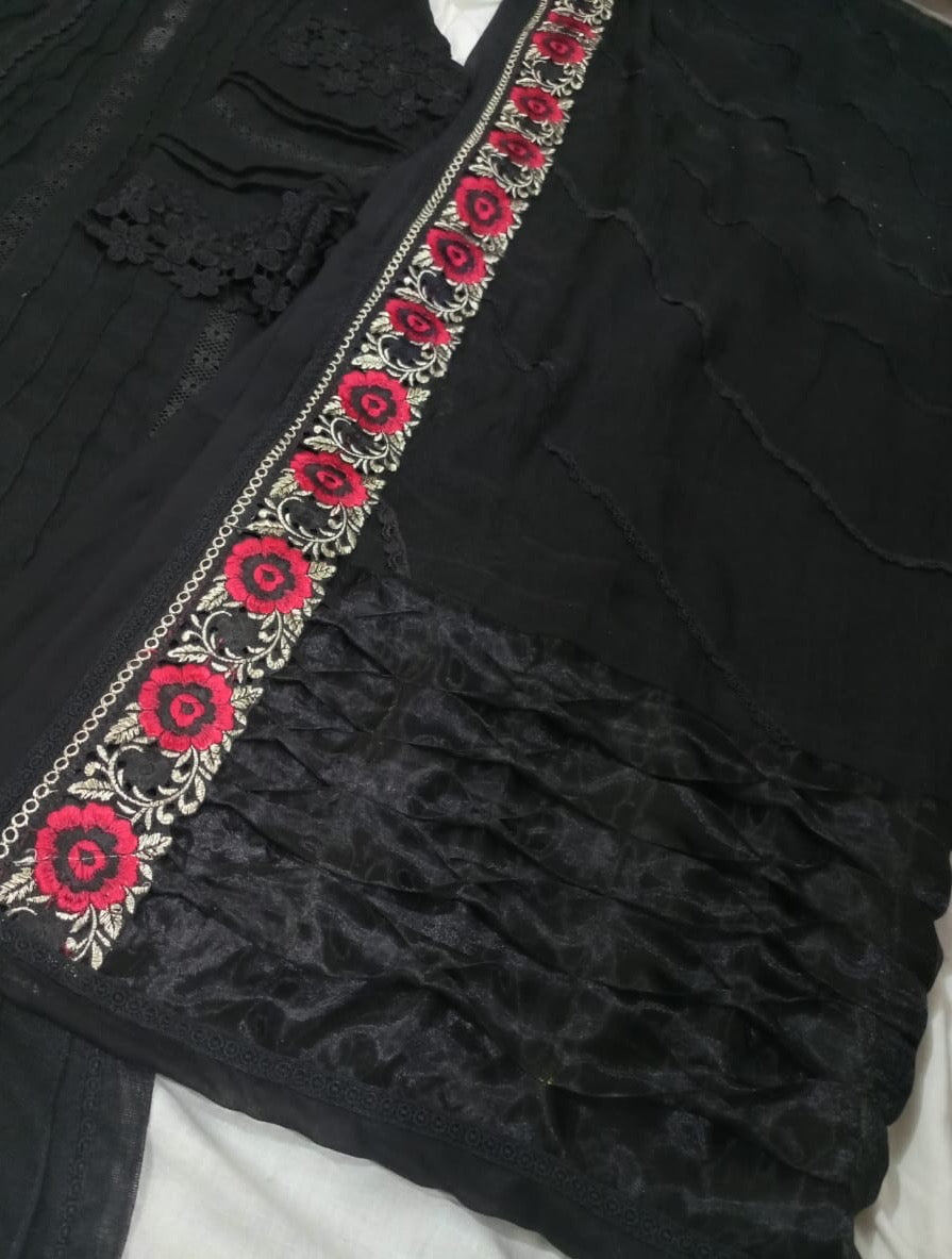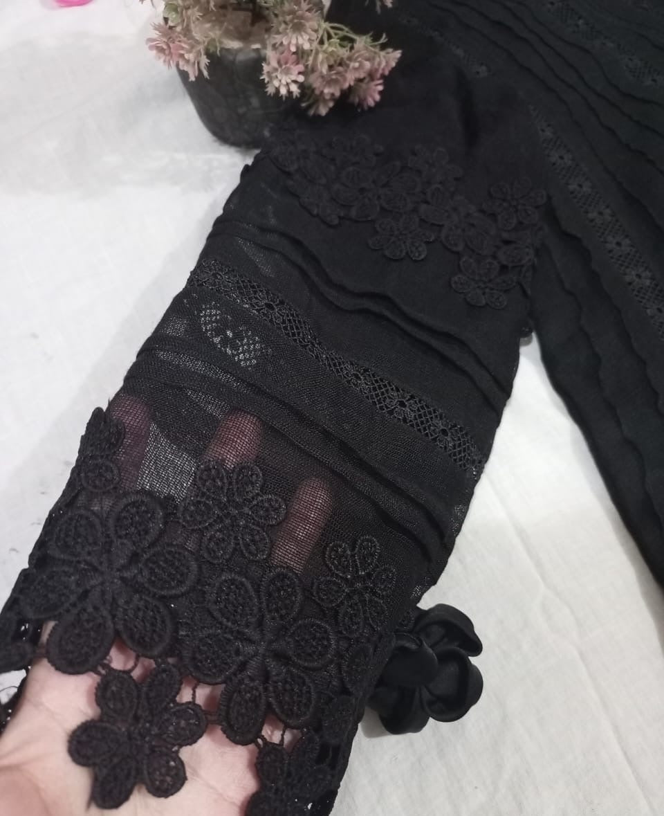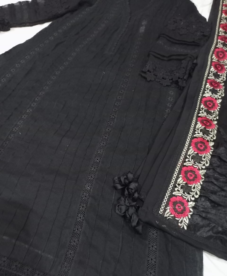 Introducing Juggun - the perfect evening party attire. Made with intricate details on luxurious Khaadi net fabric, this black dress exudes elegance. The dupatta is adorned with twist work and the shirt features beautiful cutwork laces. Make a statement with Juggun.