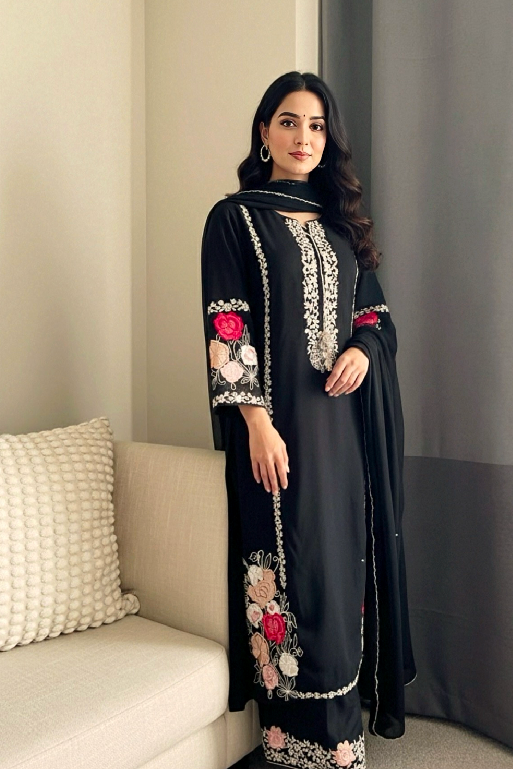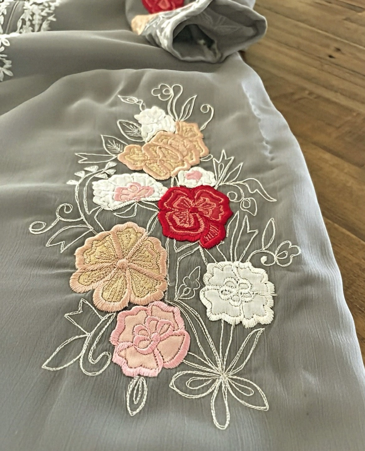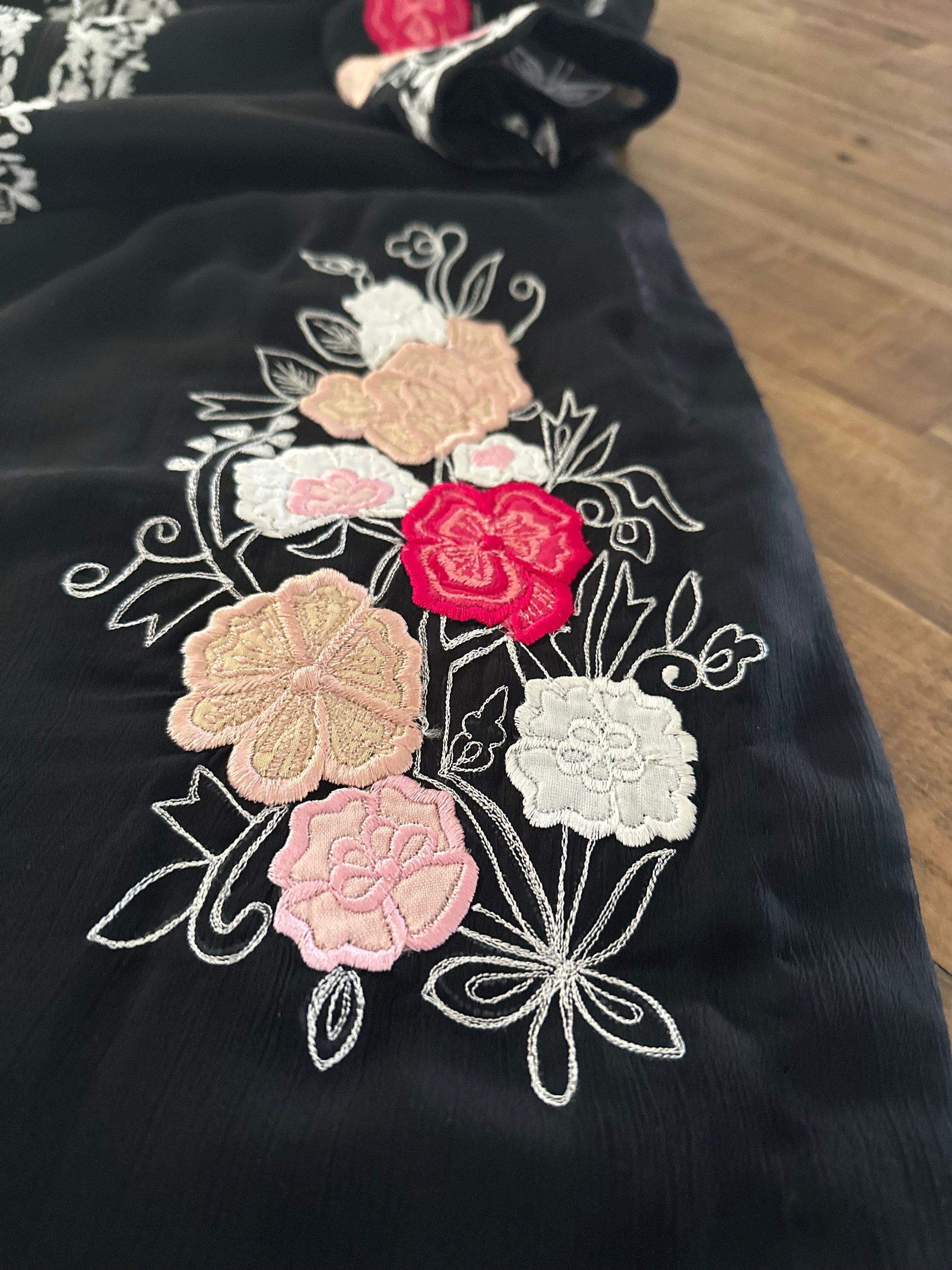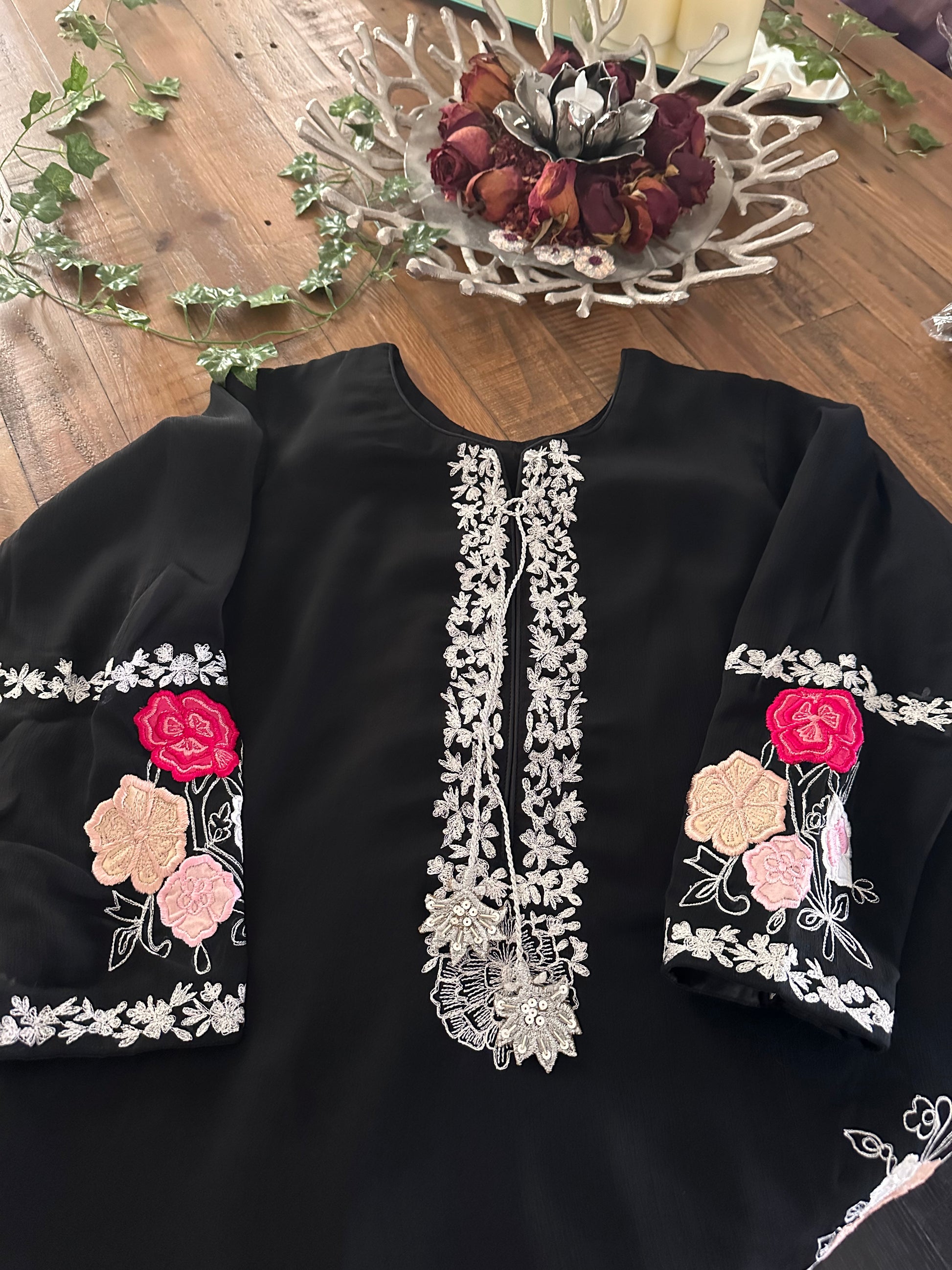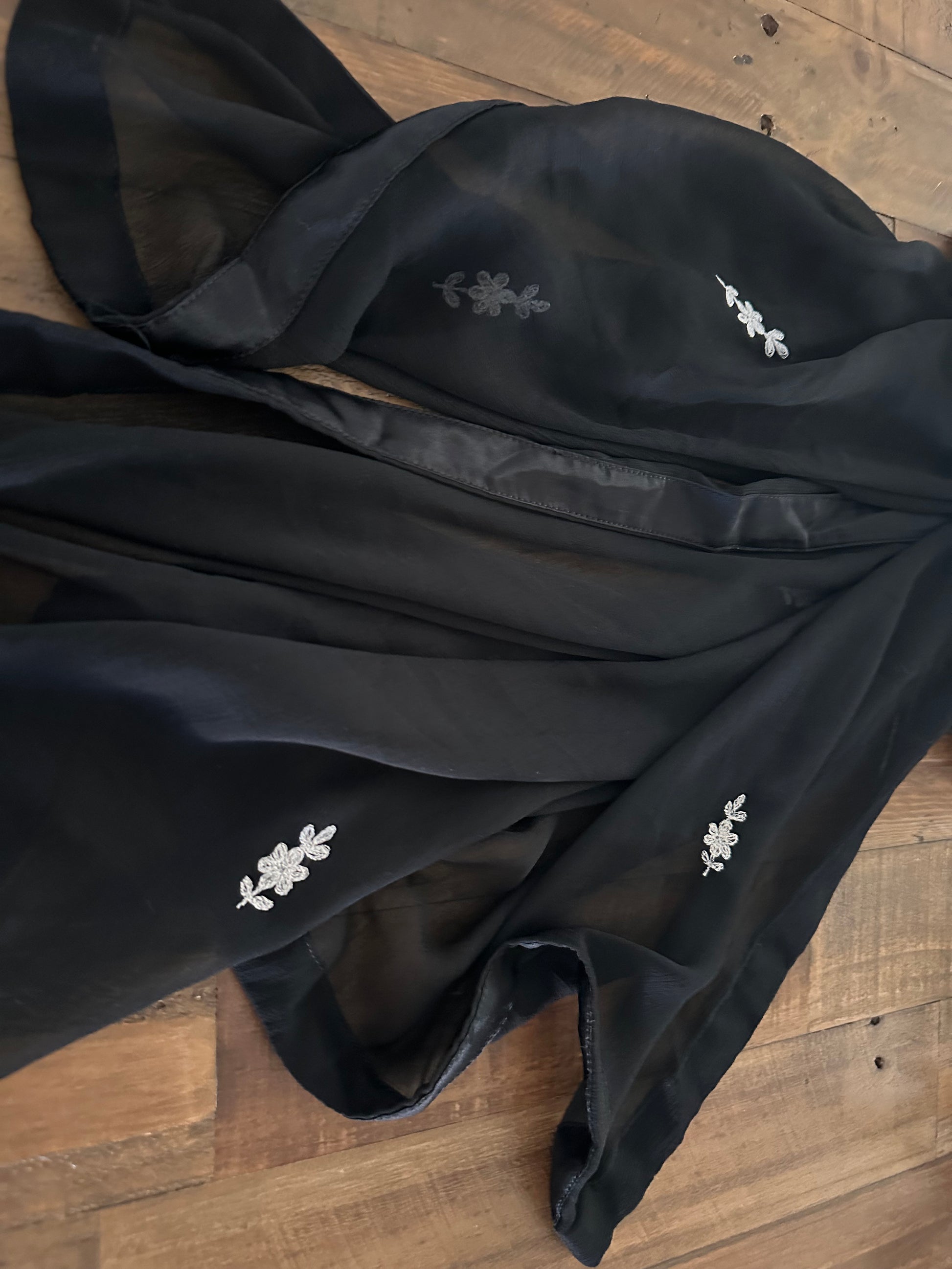 A timeless creation inspired by the stillness of night. Draped in deep black chiffon. Layl embodies mystery and grace. The hand-embroidered detailing shimmers like stars against the night sky, making it the perfect choice for evening gatherings, festive occasions, and moments that call for understated elegance.