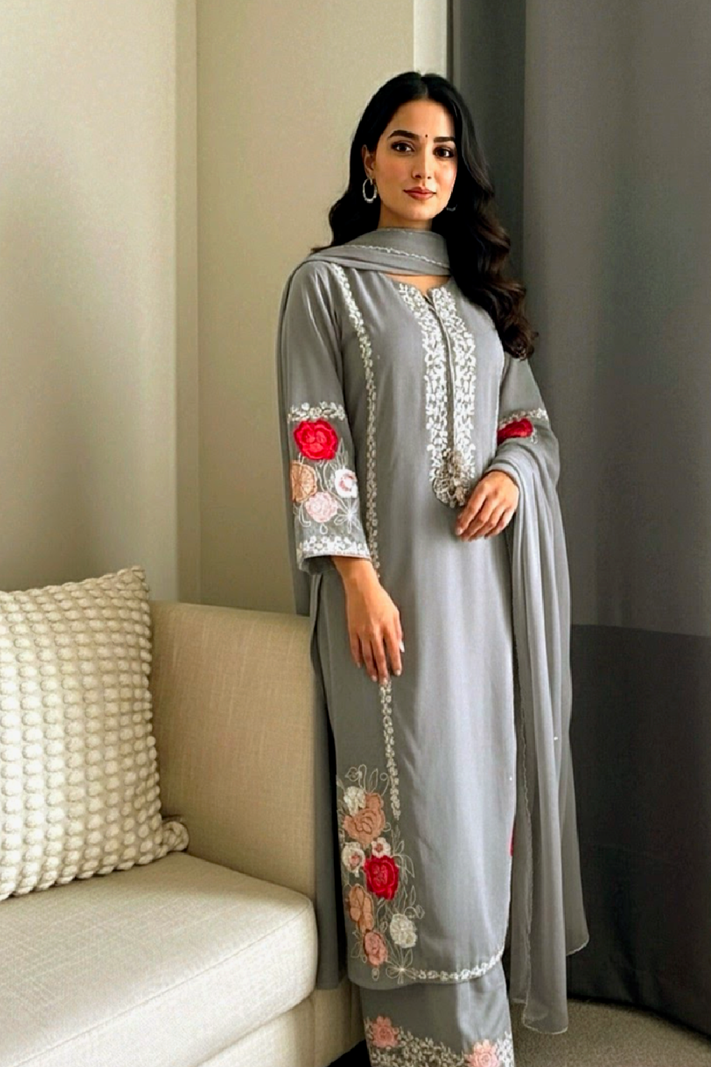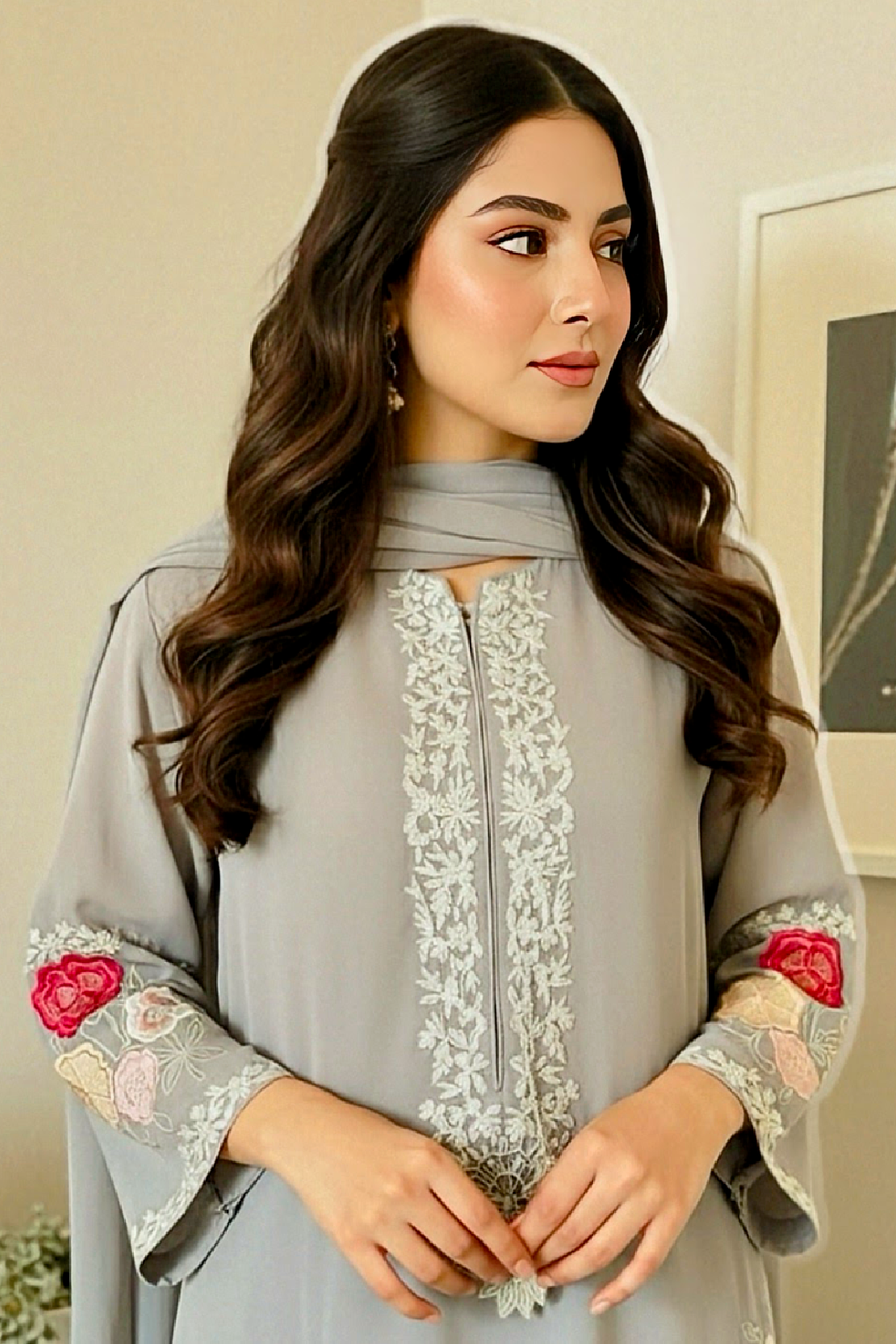 Pair Layl with delicate silver or diamond jewelry to highlight the embroidery’s subtle shimmer. Opt for soft waves or a sleek bun for a polished evening look. Complete with metallic heels or classic black sandals for timeless elegance.