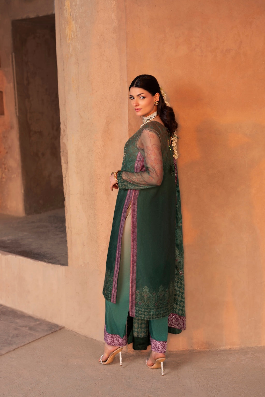 Photographed at the historic Baradari of Hiran Minar, the design carries the soul of heritage while remaining effortlessly modern